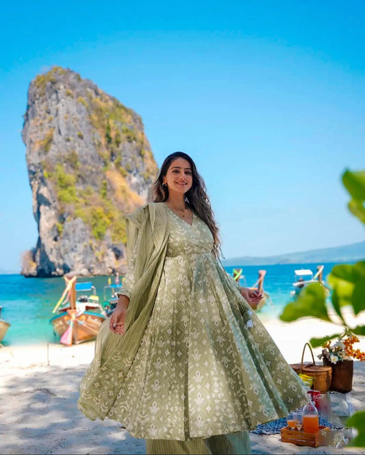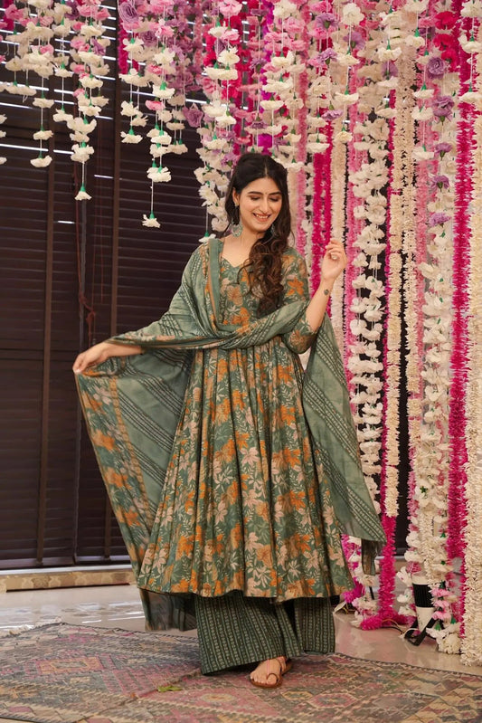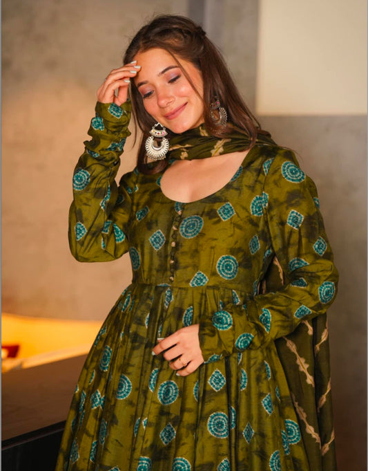 Price dropMatrut | Pehchan Mehendi Green Anarkali Suit