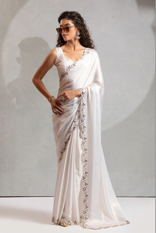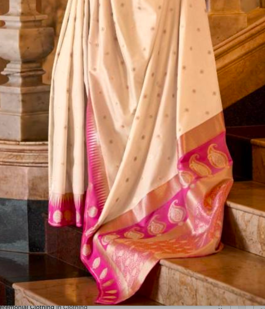Price dropMatrut | Velvi Banarsi White & Pink Saree