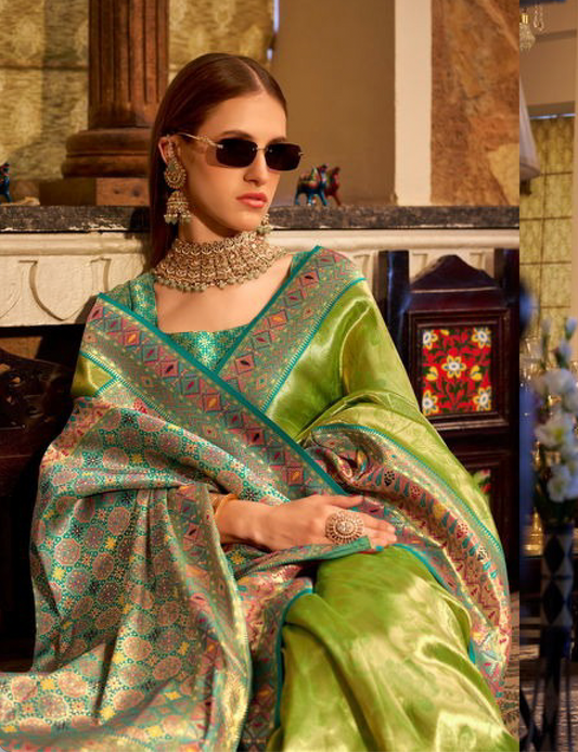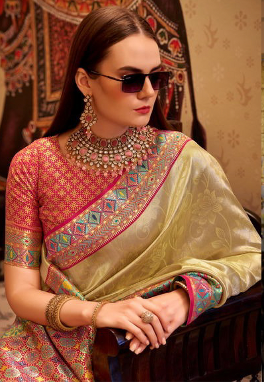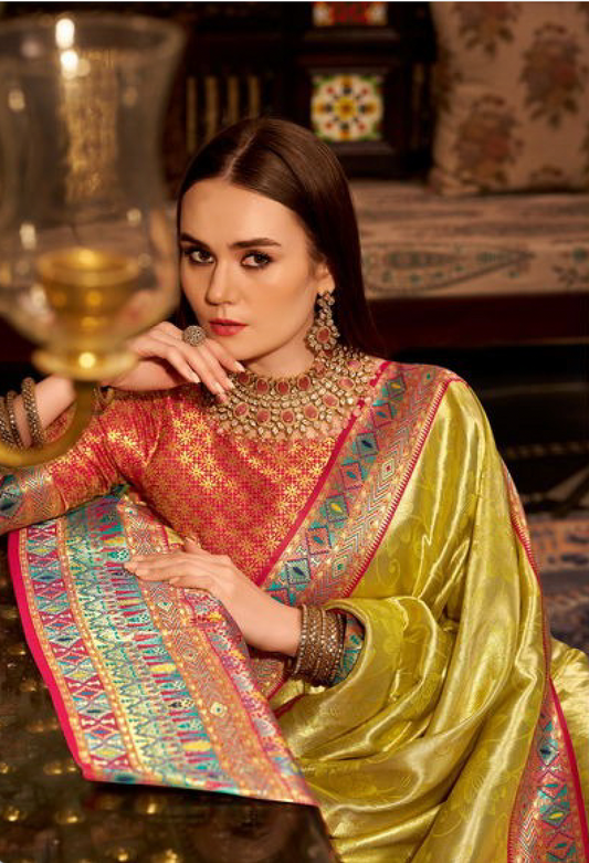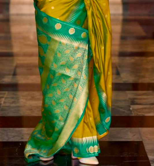 Price dropMatrut | Velvi Banarsi Mustard Green Saree