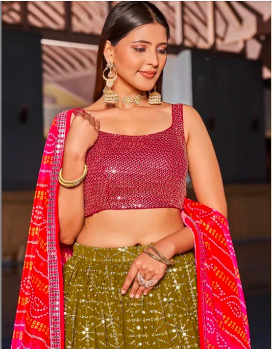 Price dropMatrut | Golden Palm Mehendi Green Lehenga