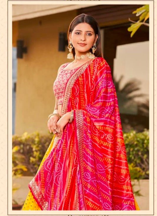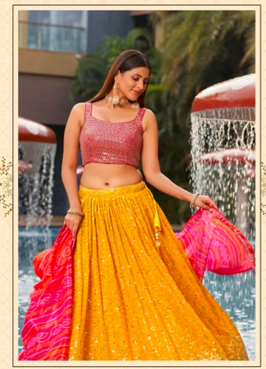 Price dropMatrut | Golden Palm Yellow-Pink Lehenga