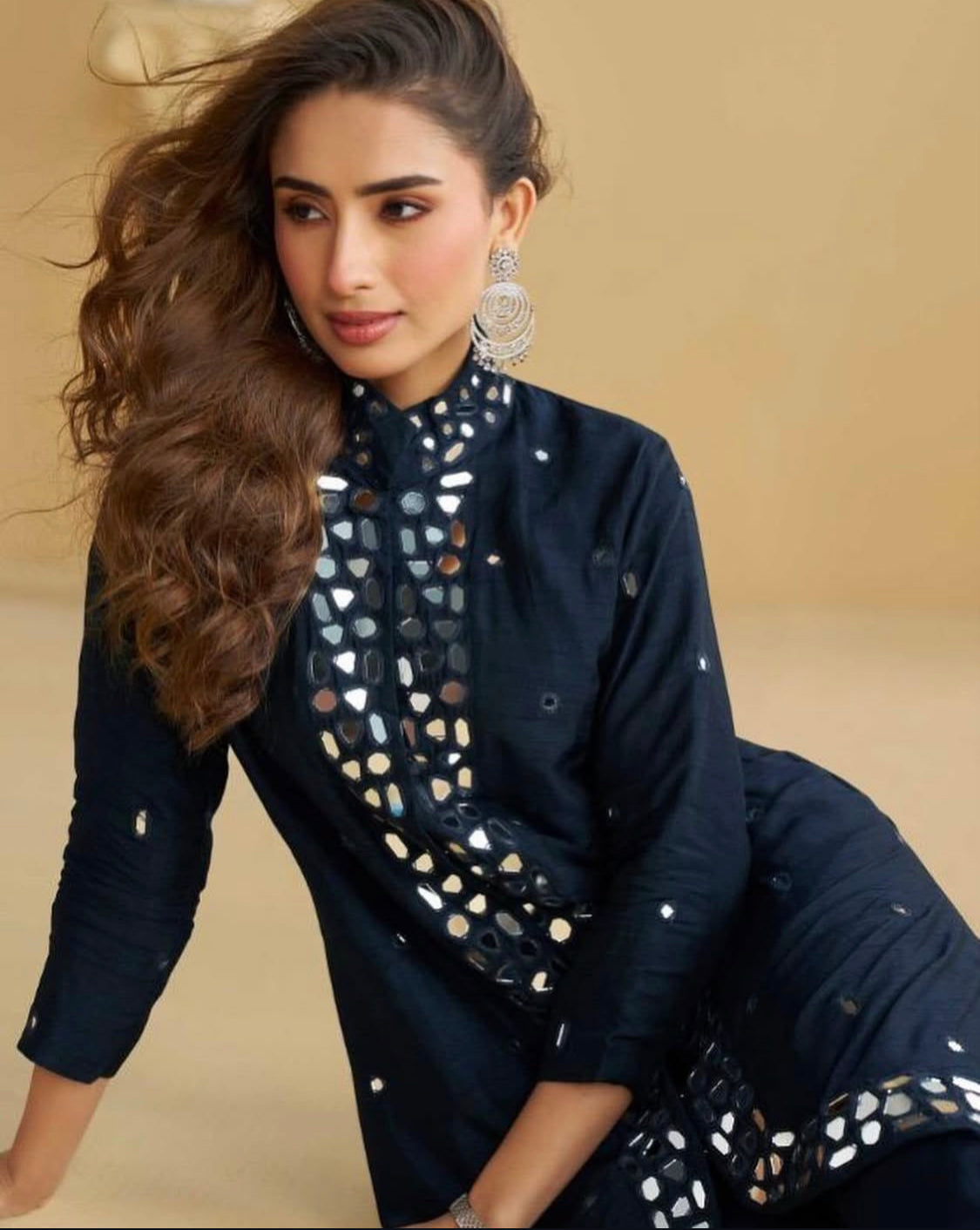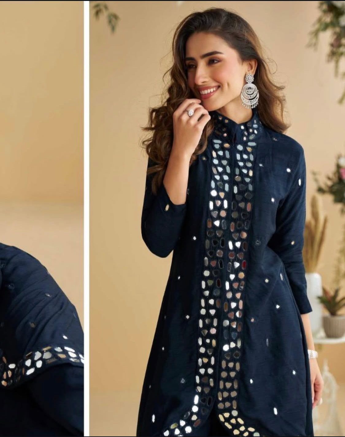 Pattern: Top/Bottom/Dupatta :- Premium Real Silk ( Trendy Festive Look Embroidered Mirror Work Top With Palazzo Pant And Embroidered Organza Dupatta )