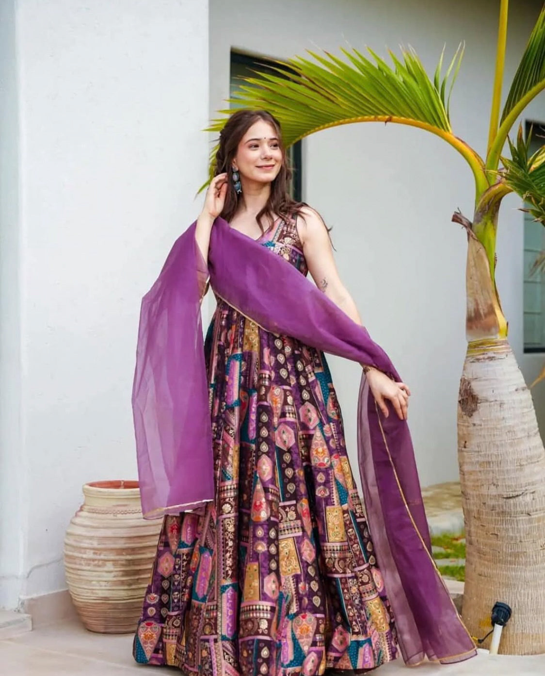 Pattern: Gown: silk | Work: Digital Printed | Sleeves: Fabric attached inside | Inner:-Full Inner | Length: - up to 56 inch” | Flair:- up to 3.5 mtr | Dupatta: Organza | Length:-2.5Mtr Approx | Style: Anarkali, Fully Flared