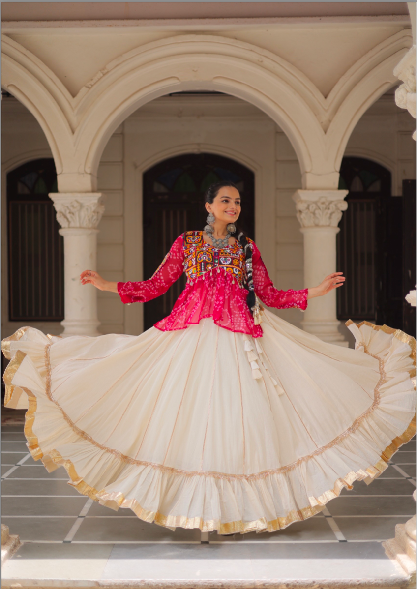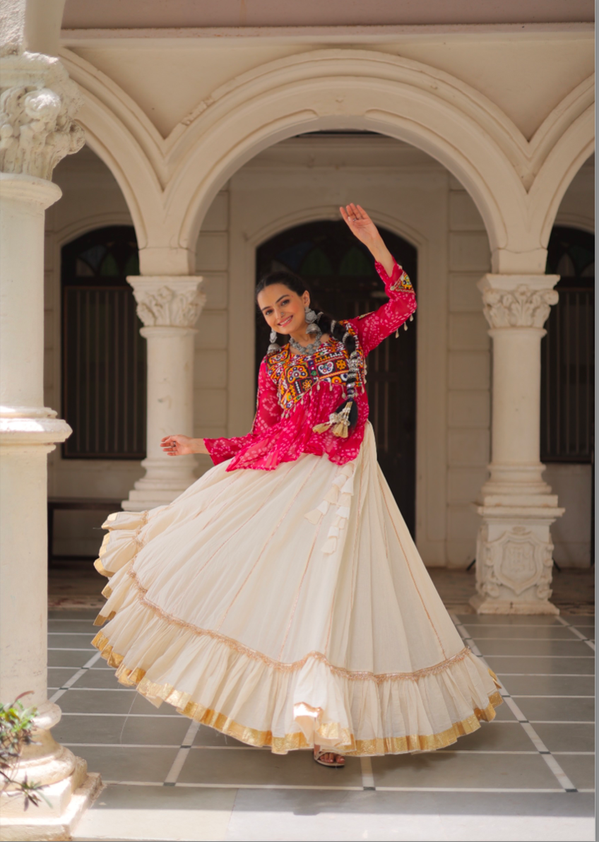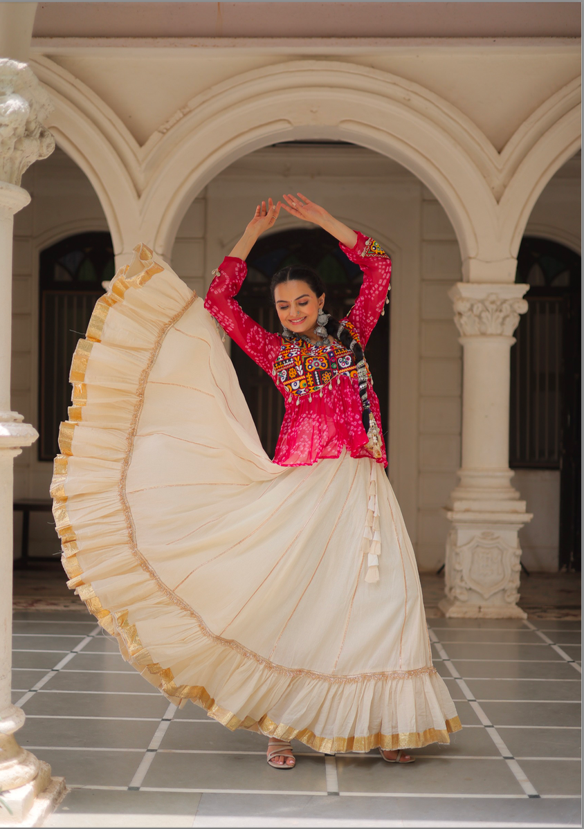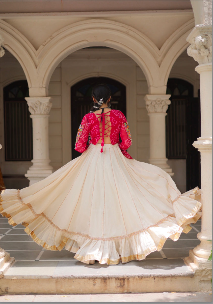 Pattern: Skirt : Kora Cotton With Attractive Gota-Patti Lace | Length :- 42'' | Waist :- 42'' | Inner :- Cotton | Flair :- 8Mtr ( 16 Kali Stitching) | Closure :- Chain Attached & With Dori Drawstring | Top : Bandhani Print work with Kutchi Gamthi Patch work Work | Length:- 23"