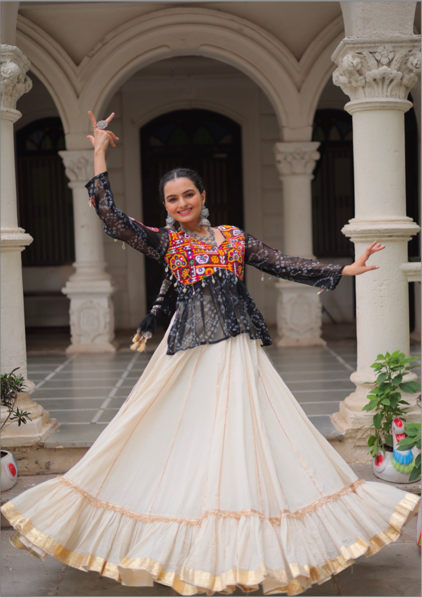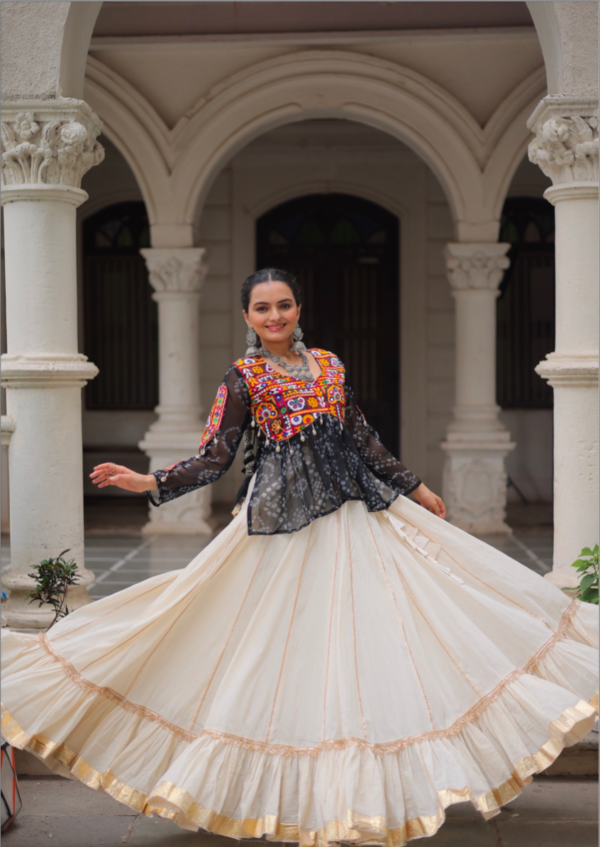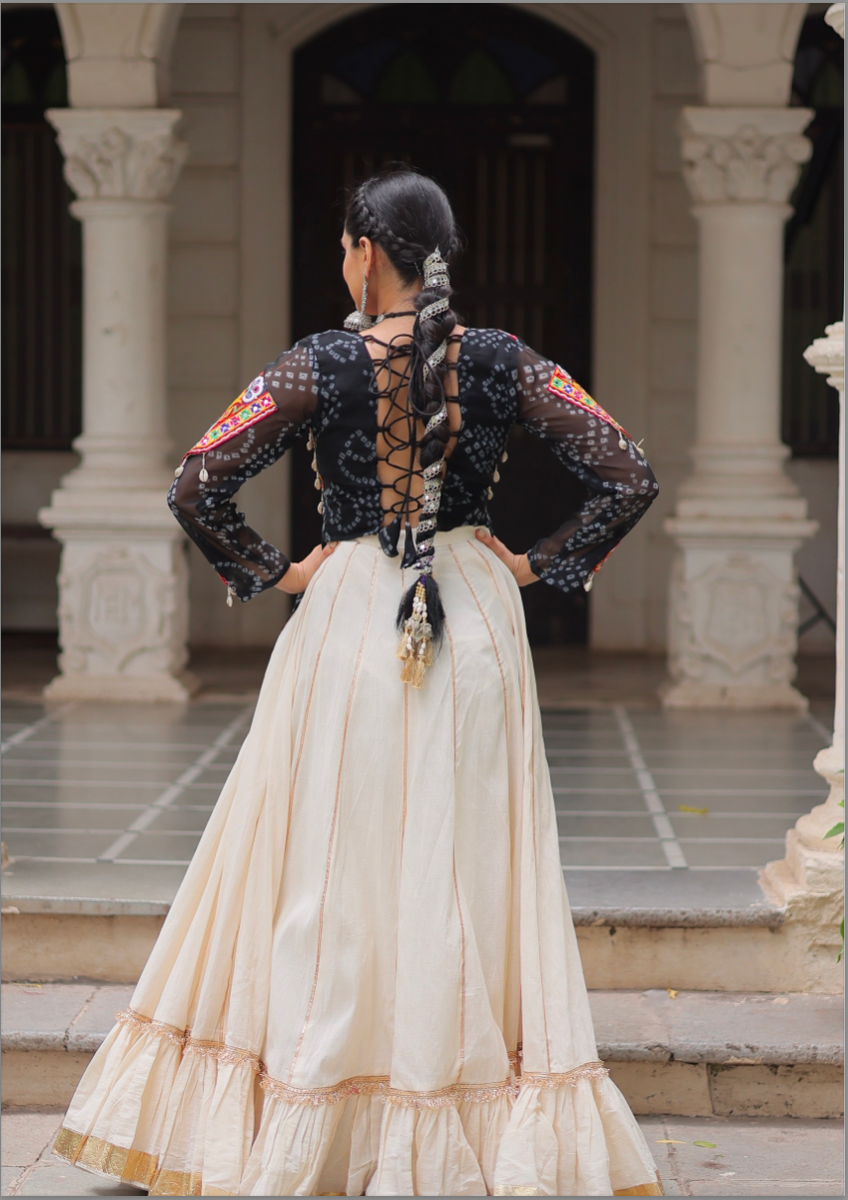 Pattern: Skirt : Kora Cotton With Attractive Gota-Patti Lace | Length :- 42'' | Waist :- 42'' | Inner :- Cotton | Flair :- 8Mtr ( 16 Kali Stitching) | Closure :- Chain Attached & With Dori Drawstring | Top : Bandhani Print work with Kutchi Gamthi Patch work Work | Length:- 23"