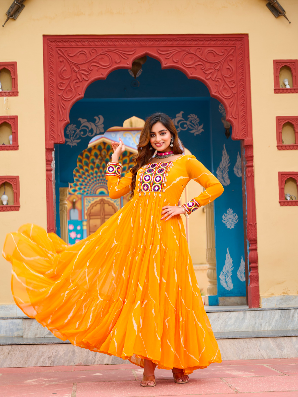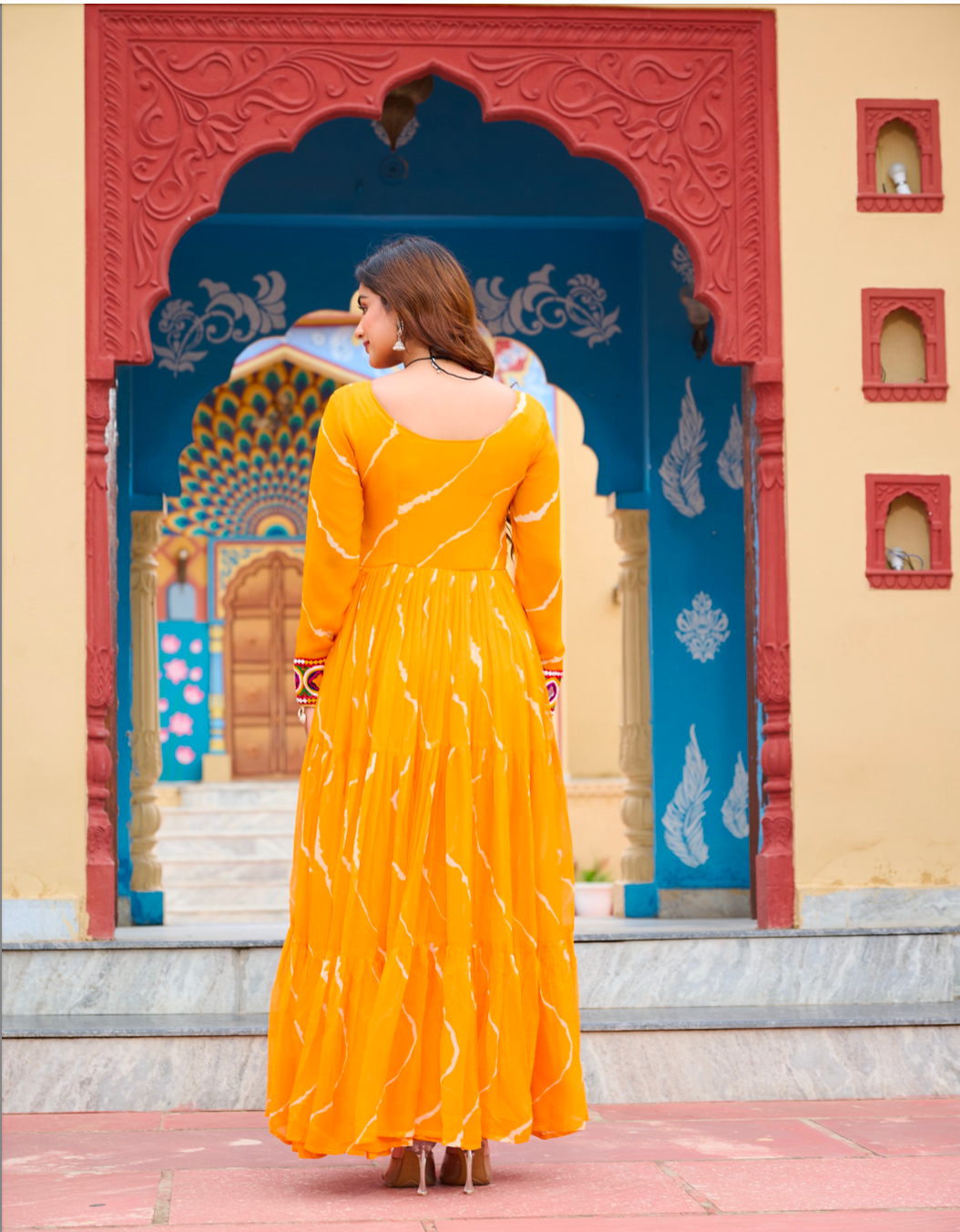 - Details: Laheriya Print with kutchi patchework in Faux Georgette | Sleeves :- Full Sleeves | Length :- 56 Inch| Flair :- 12 Meter | Lining(Inner) :- Cotton (full upto bottom)