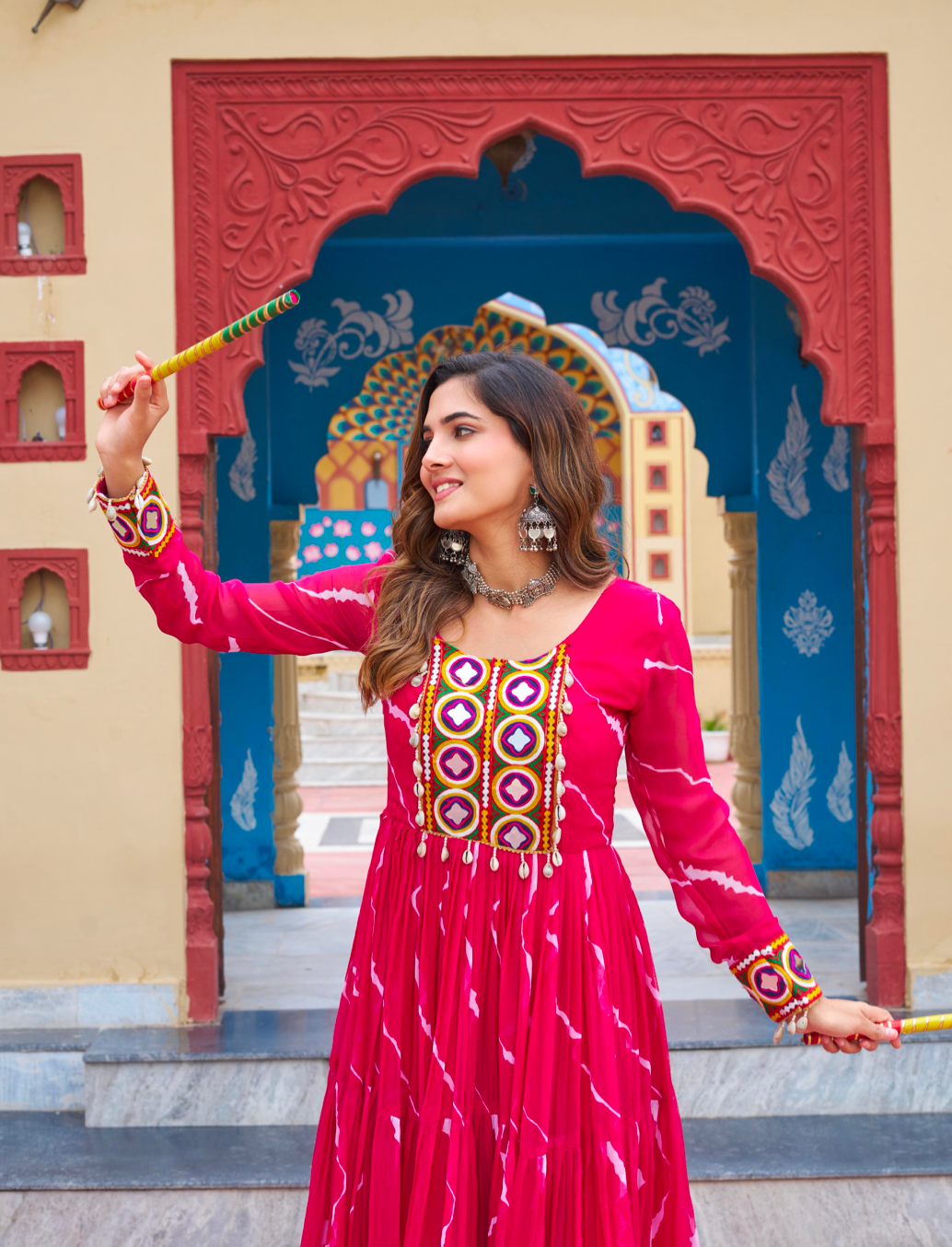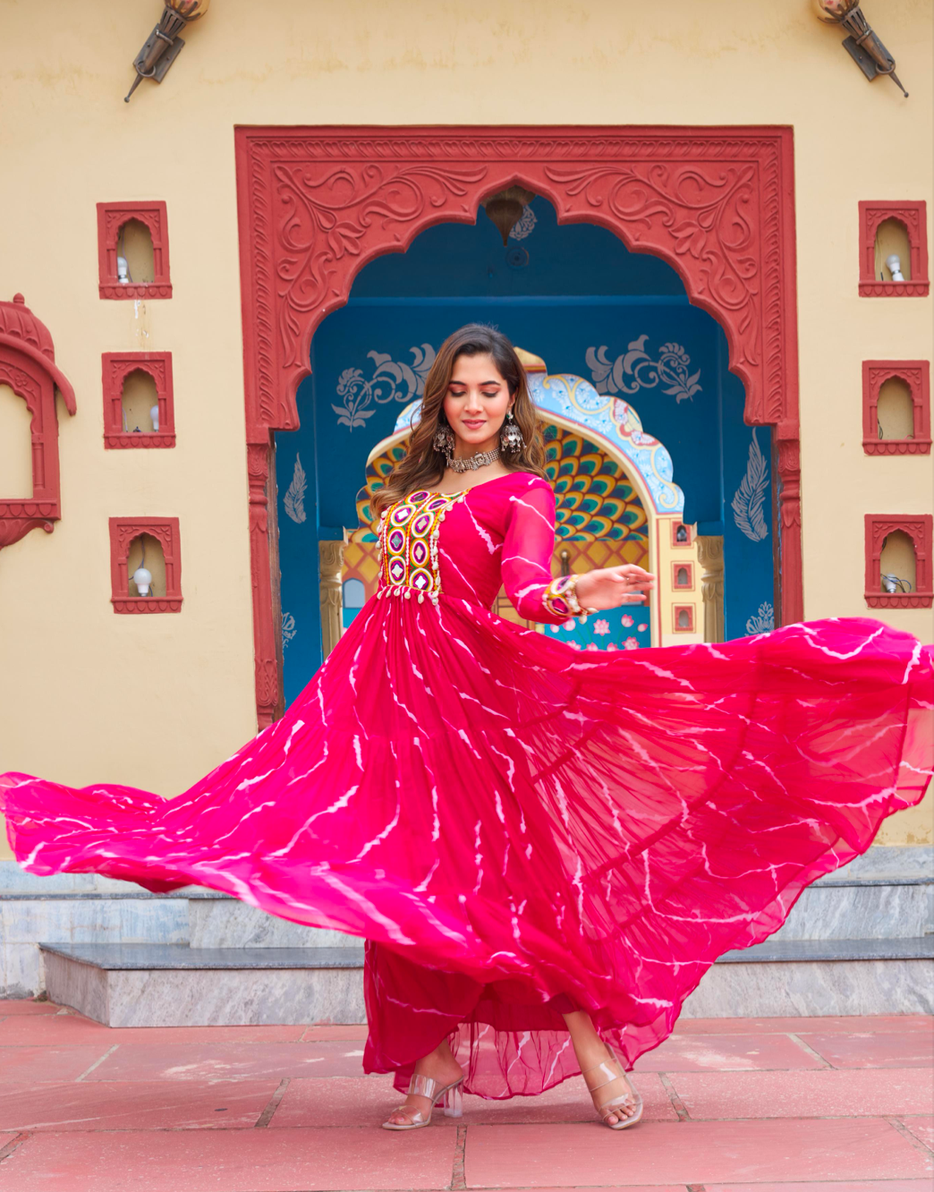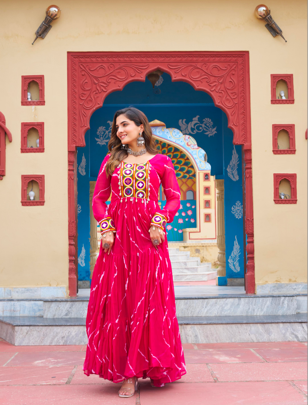 - Details: Laheriya Print with kutchi patchework in Faux Georgette | Sleeves :- Full Sleeves | Length :- 56 Inch| Flair :- 12 Meter | Lining(Inner) :- Cotton (full upto bottom)