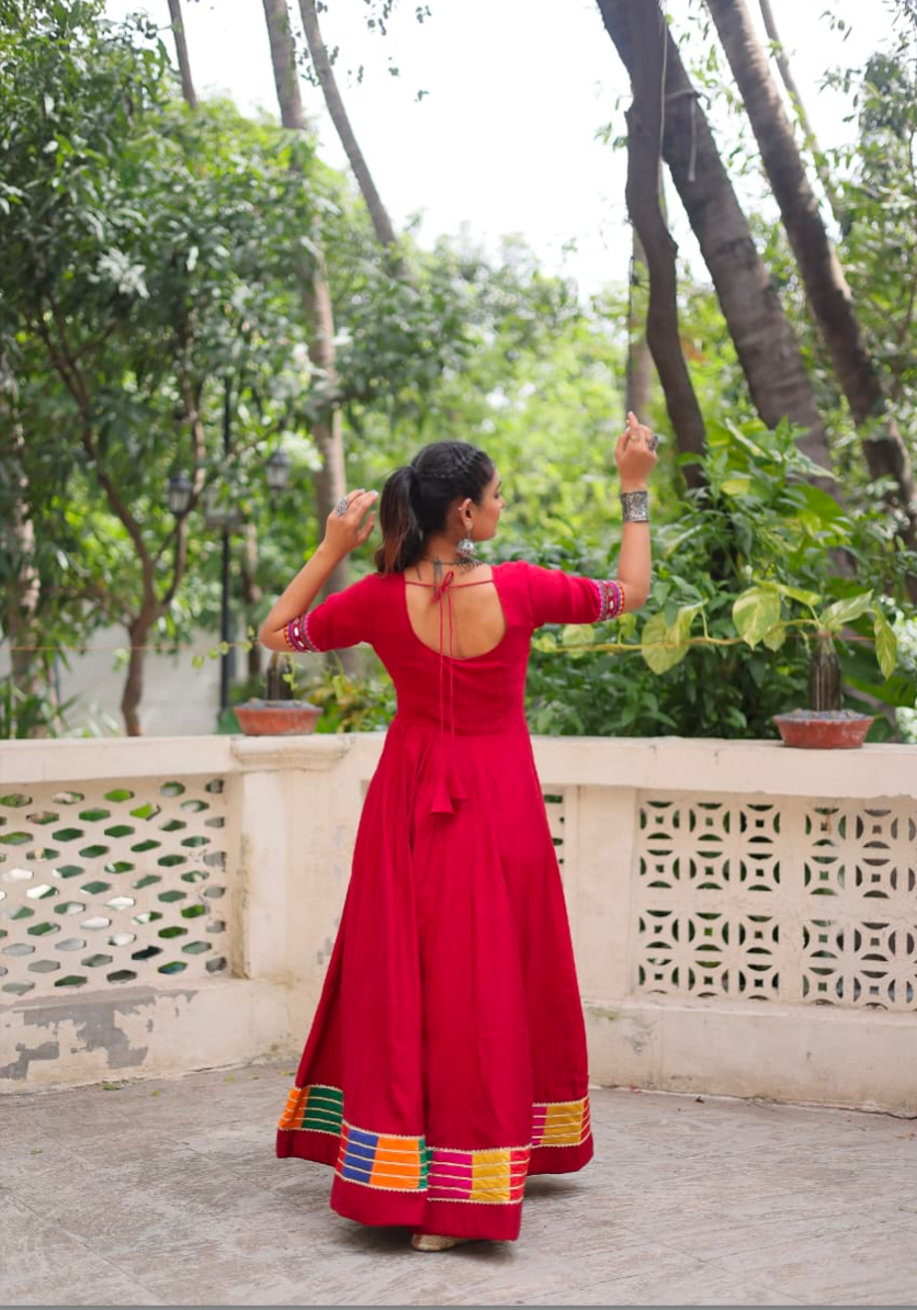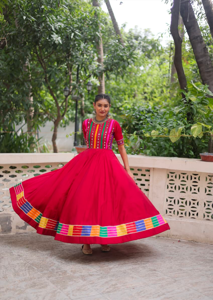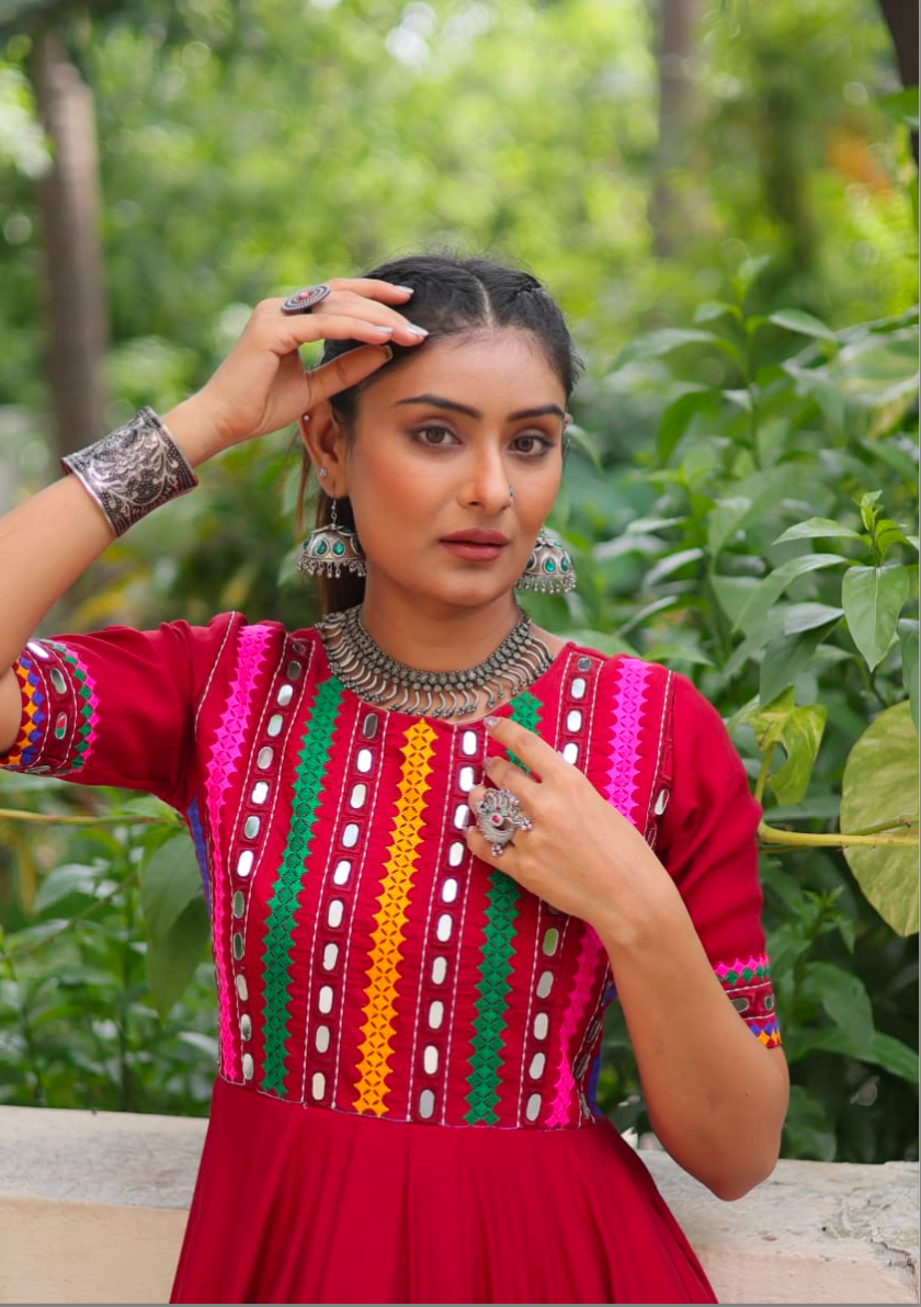 - Details: Roman With red multicolor Thread and Mirror Work | Sleeves :- Half Sleeves | Length :- 56 Inch | Flair :- 4 Meter (16 Kali ) | Lining (Inner) :- Cotton