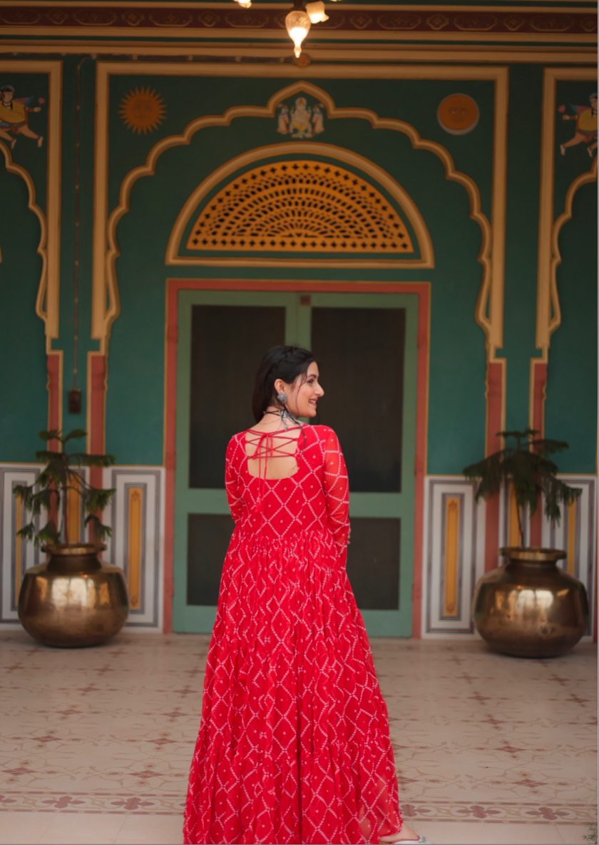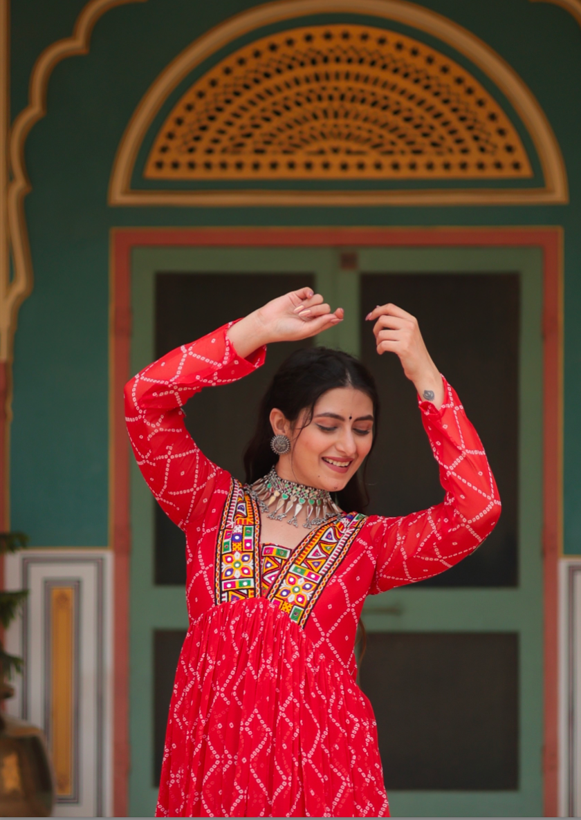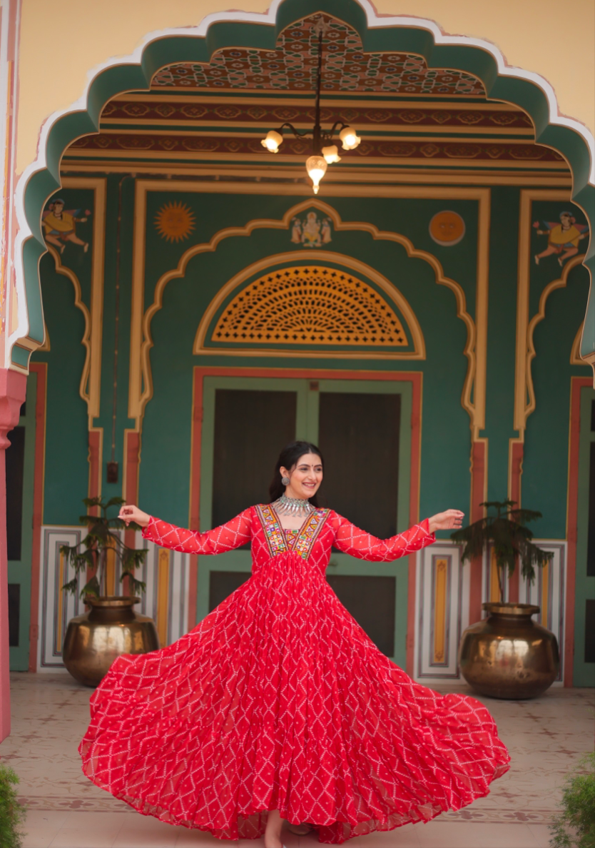- Details: Bandhani Print work with kutchi patchework in Faux Georgette | Sleeves :- Full Sleeves | Length :- 56 Inch | Flair :- 12 Meter | Lining(Inner) :- Cotton (full upto bottom)