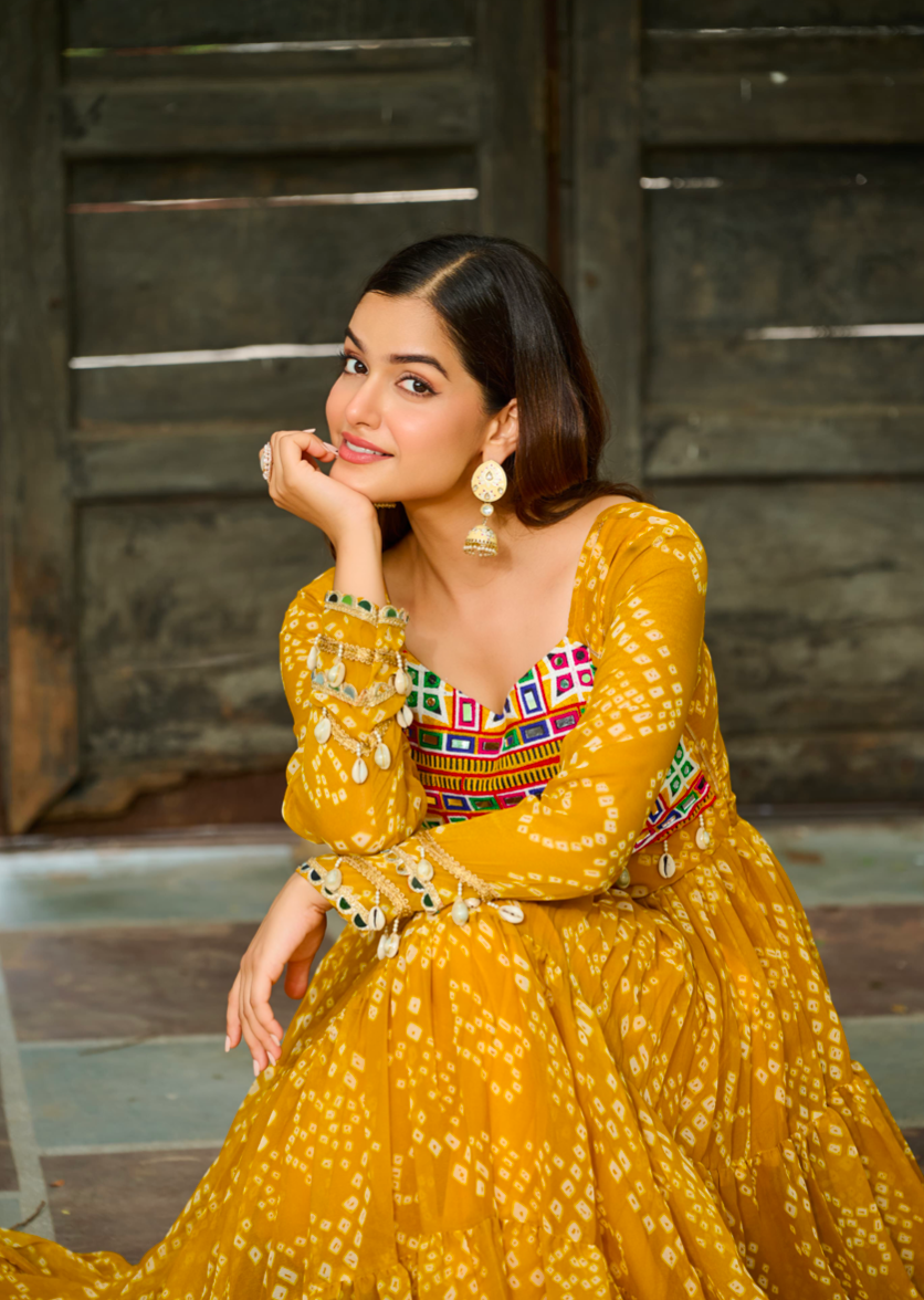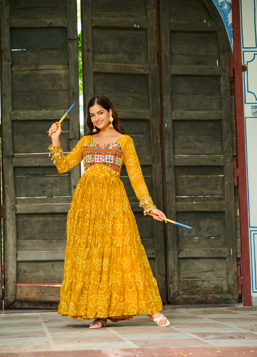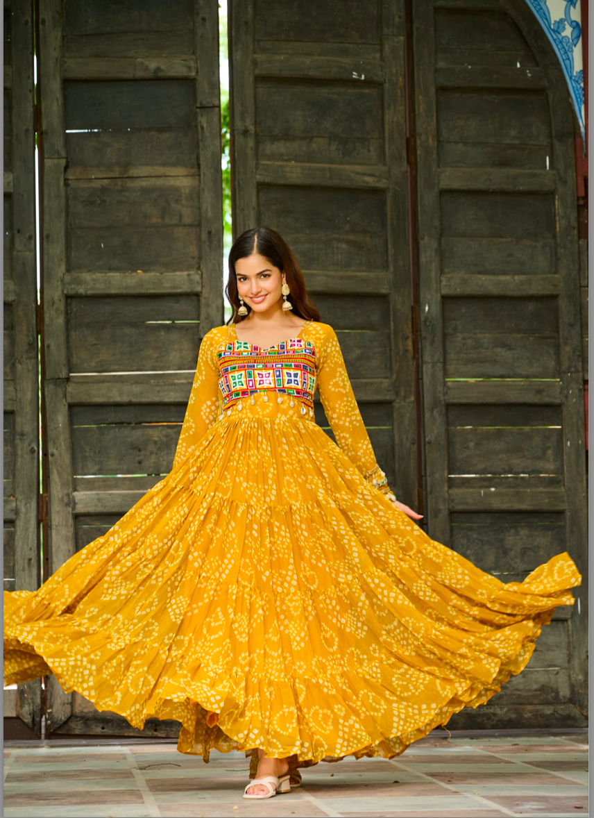 - Details: Bandhani Print work with kutchi patch work in Faux Georgette | Sleeves :- Full Sleeves | Length :- 56 Inch | Flair :- 12 Meter | Lining(Inner) :- Cotton (full up to bottom)