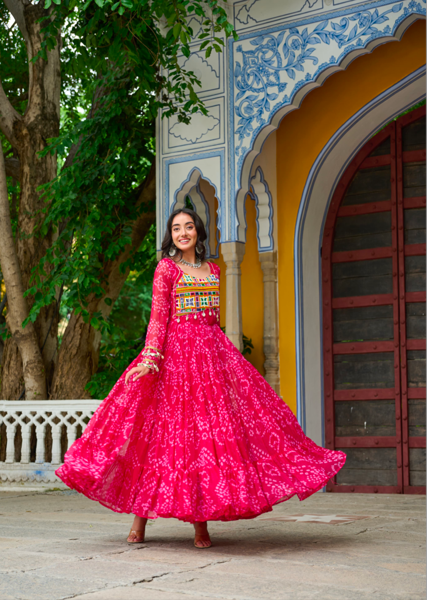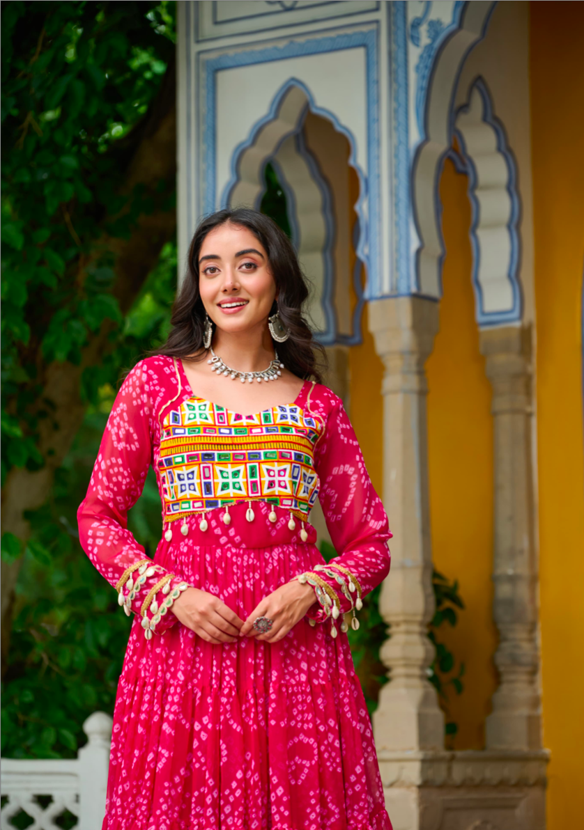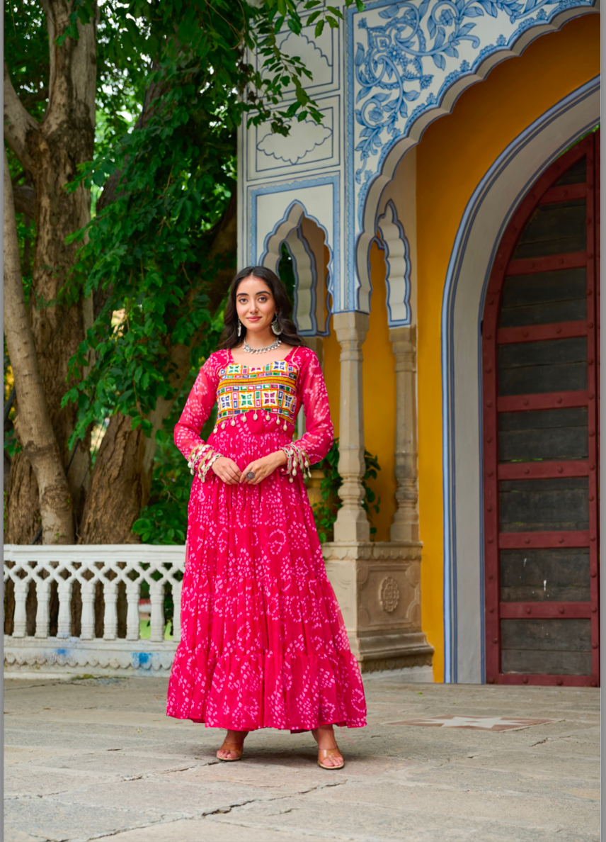 - Details: Bandhani Print work with kutchi patch work in Faux Georgette | Sleeves :- Full Sleeves | Length :- 56 Inch | Flair :- 12 Meter | Lining(Inner) :- Cotton (full up to bottom)