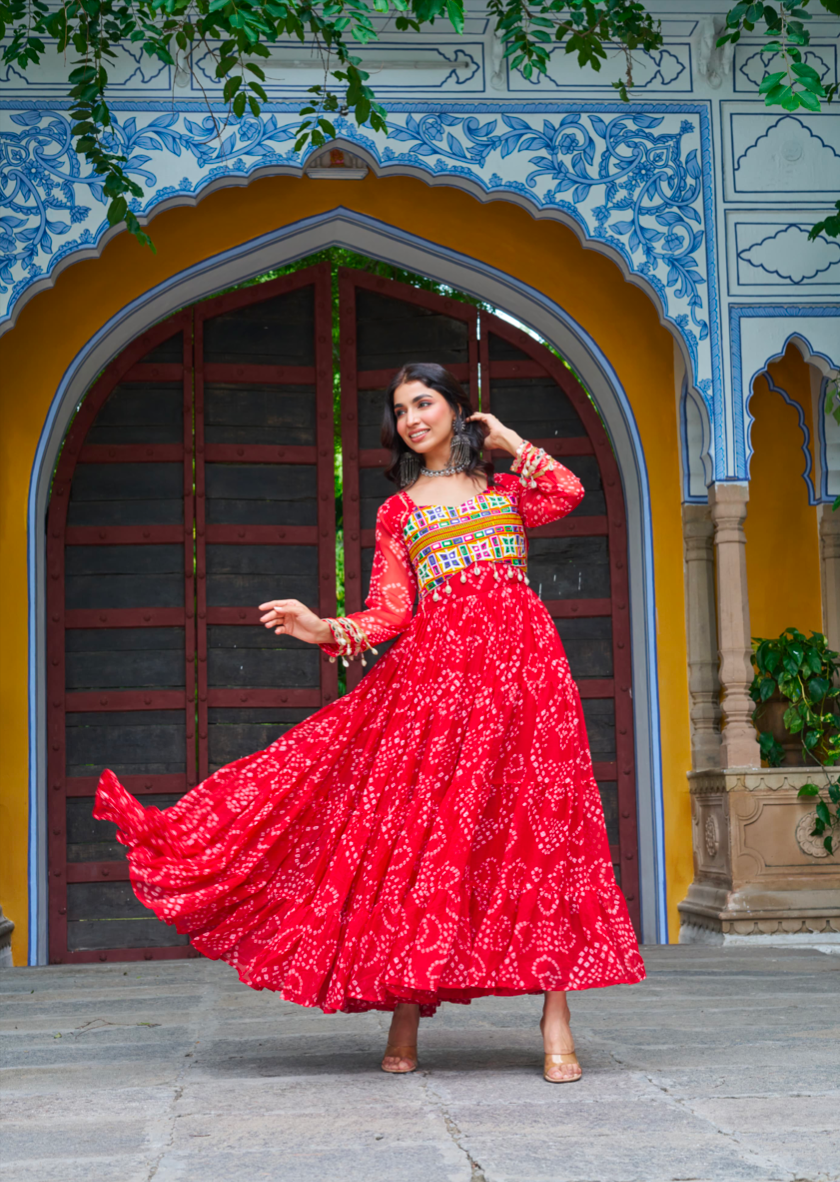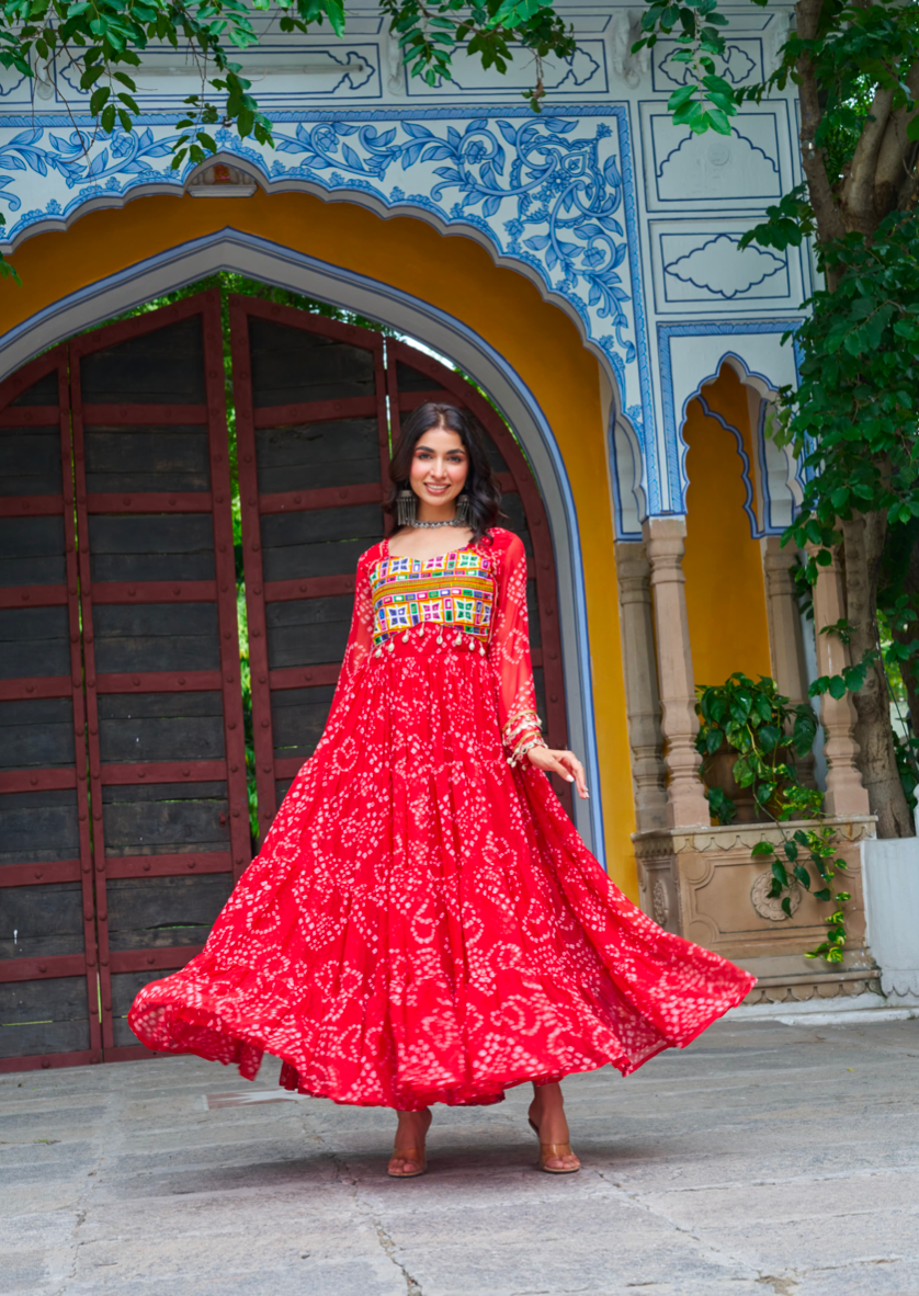 - Details: Bandhani Print work with kutchi patch work in Faux Georgette | Sleeves :- Full Sleeves | Length :- 56 Inch | Flair :- 12 Meter | Lining(Inner) :- Cotton (full up to bottom)