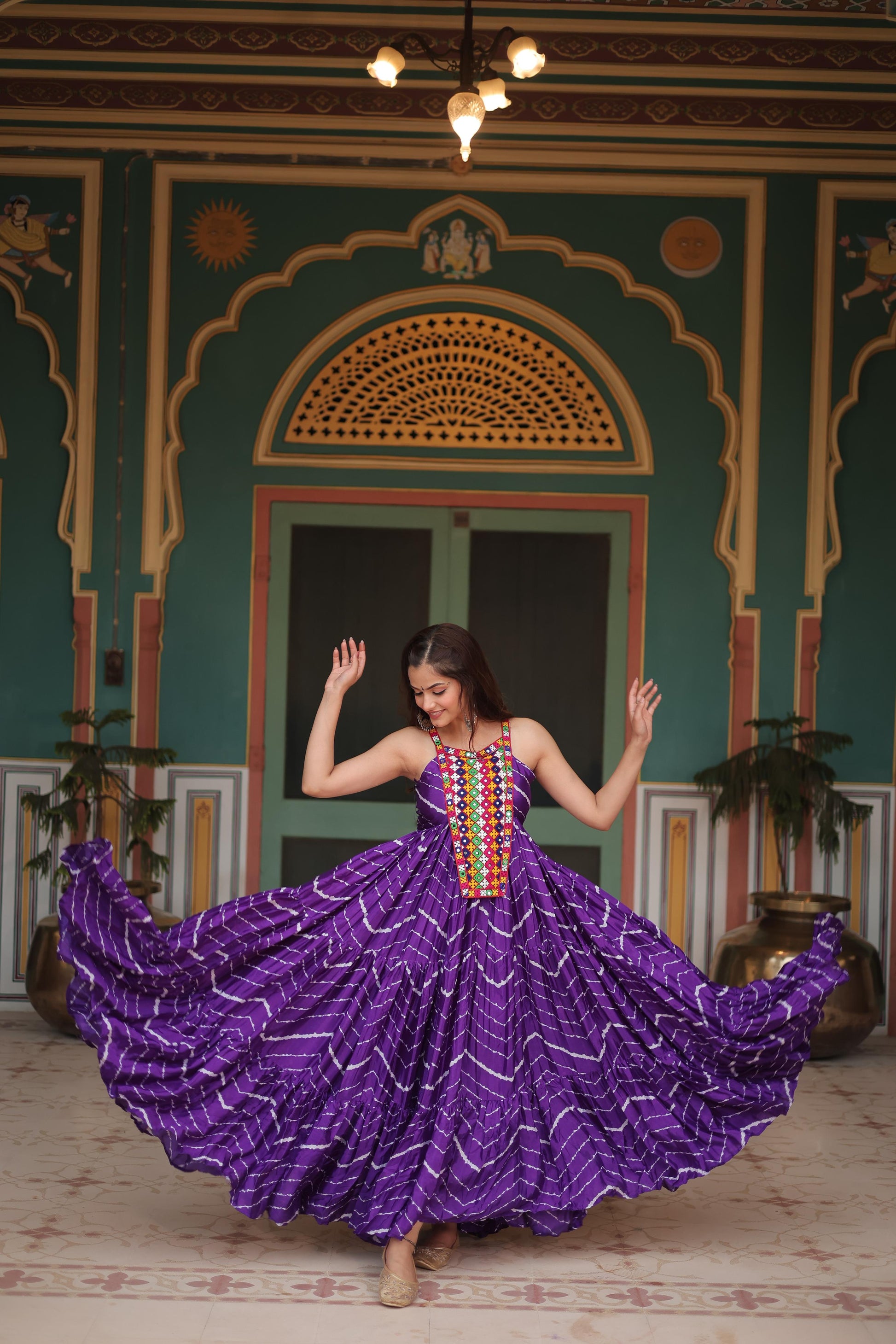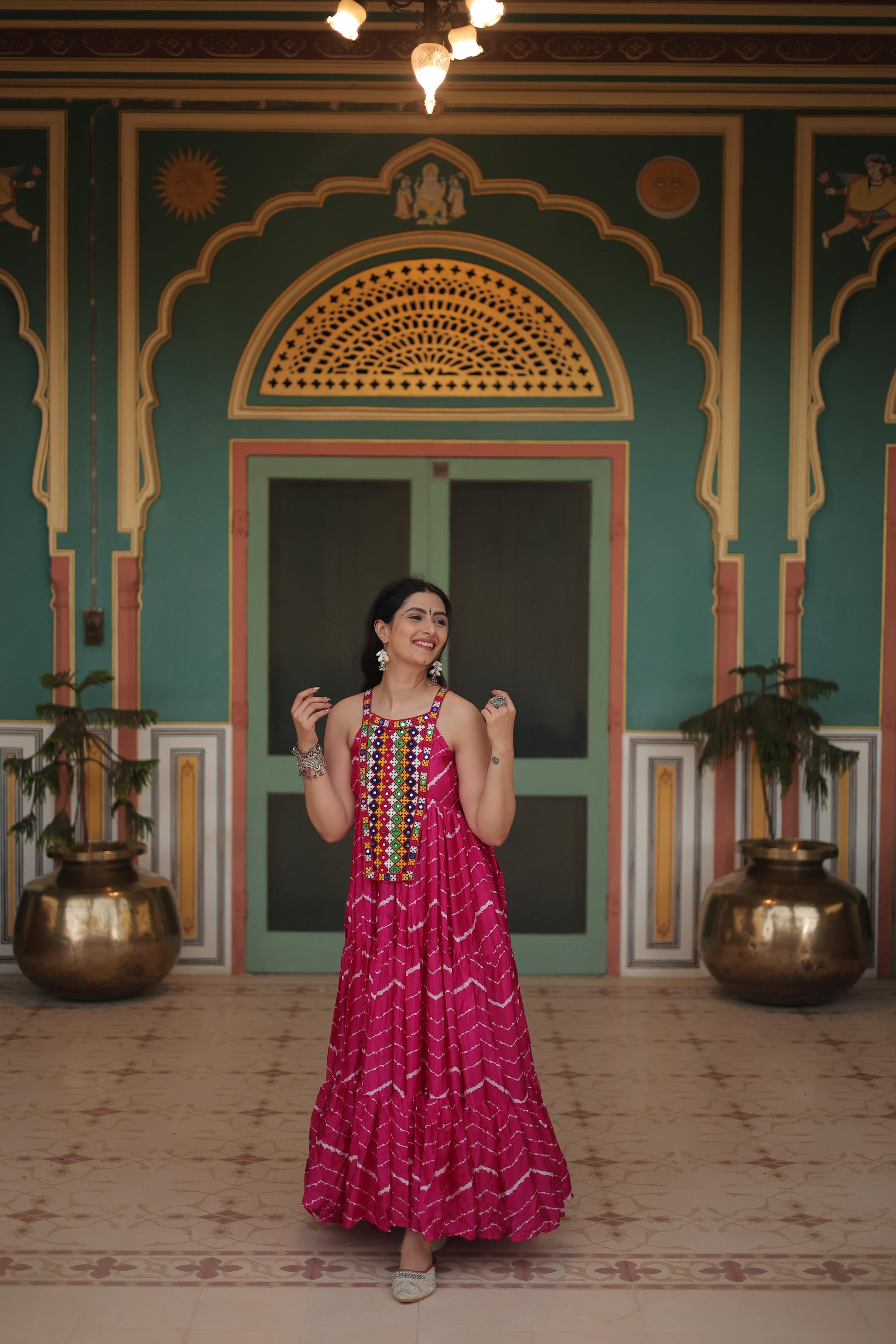 Pattern: Leheriya Print work with kutchi patch work in Chinon Fabric | Sleeves :- Sleeveless | Length :- 56 Inch | Flair :- 12 Meter | Lining(Inner) :- Cotton (full upto bottom)