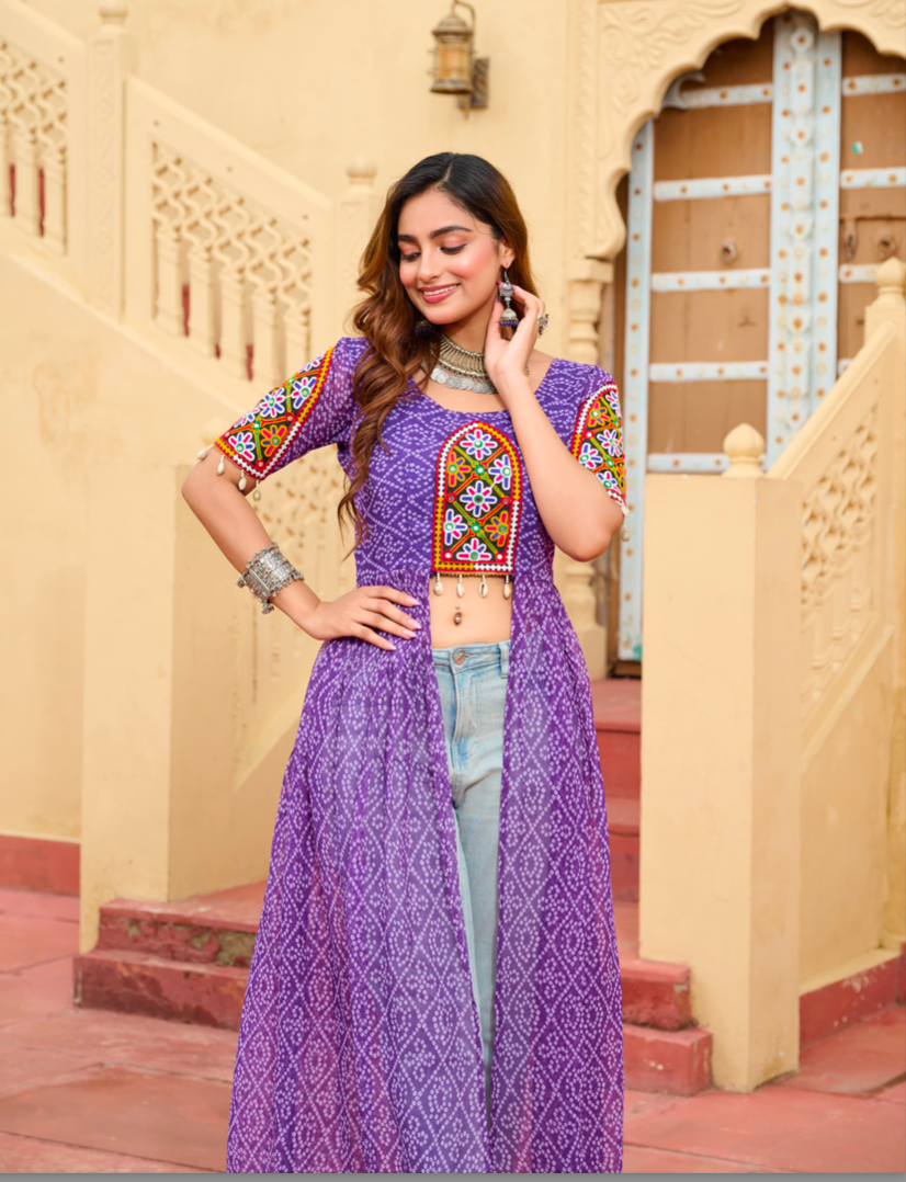 Pattern: Bandhani Print work with kutchi patch work in Faux Georgette | Length :- 52 INCH | Lining :- Cotton (Half Inner Top only) | Sleeves :- Half Sleeves | Neck Type :- Round neck