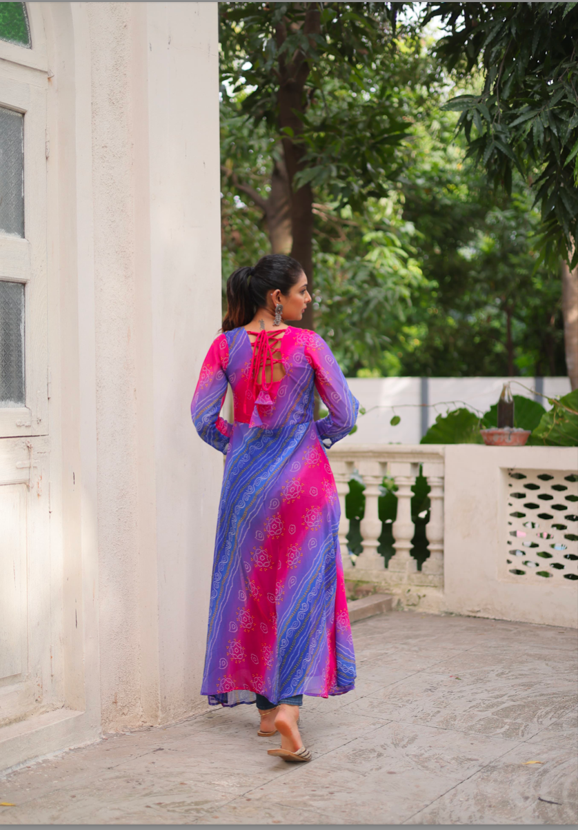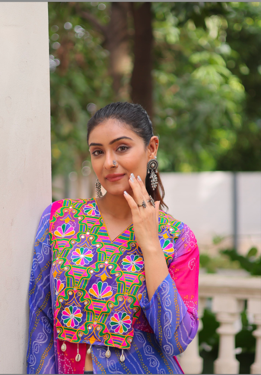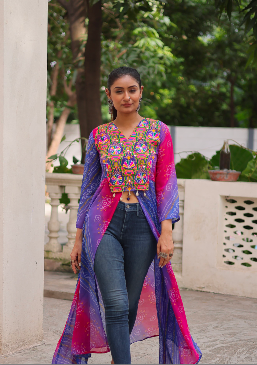 Pattern: Bandhani Print work with kutchi patch work in Faux Georgette | SIZE :- L Size ,40 Inch Stitched (User can adjust From 38" to 44" for your body comfort) | LENGTH :- 52 INCH | LINING :- Cotton (Half Inner Top only) | SLEEVES :- Half Sleeves | NECK TYPE :- V neck