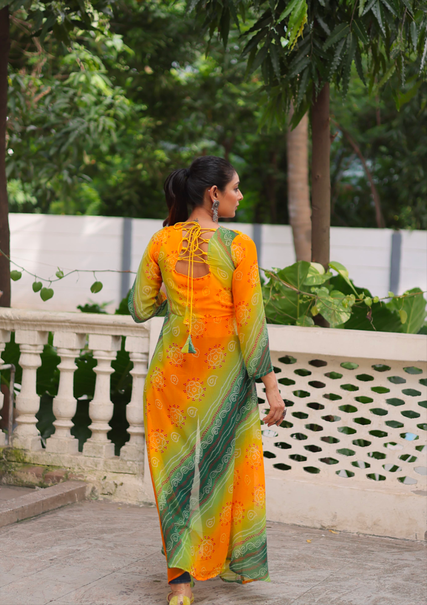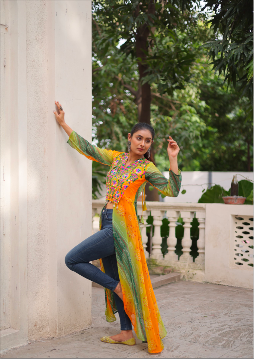 Pattern: Bandhani Print work with kutchi patch work in Faux Georgette | SIZE :- L Size ,40 Inch Stitched (User can adjust From 38" to 44" for your body comfort) | LENGTH :- 52 INCH | LINING :- Cotton (Half Inner Top only) | SLEEVES :- Half Sleeves | NECK TYPE :- V neck