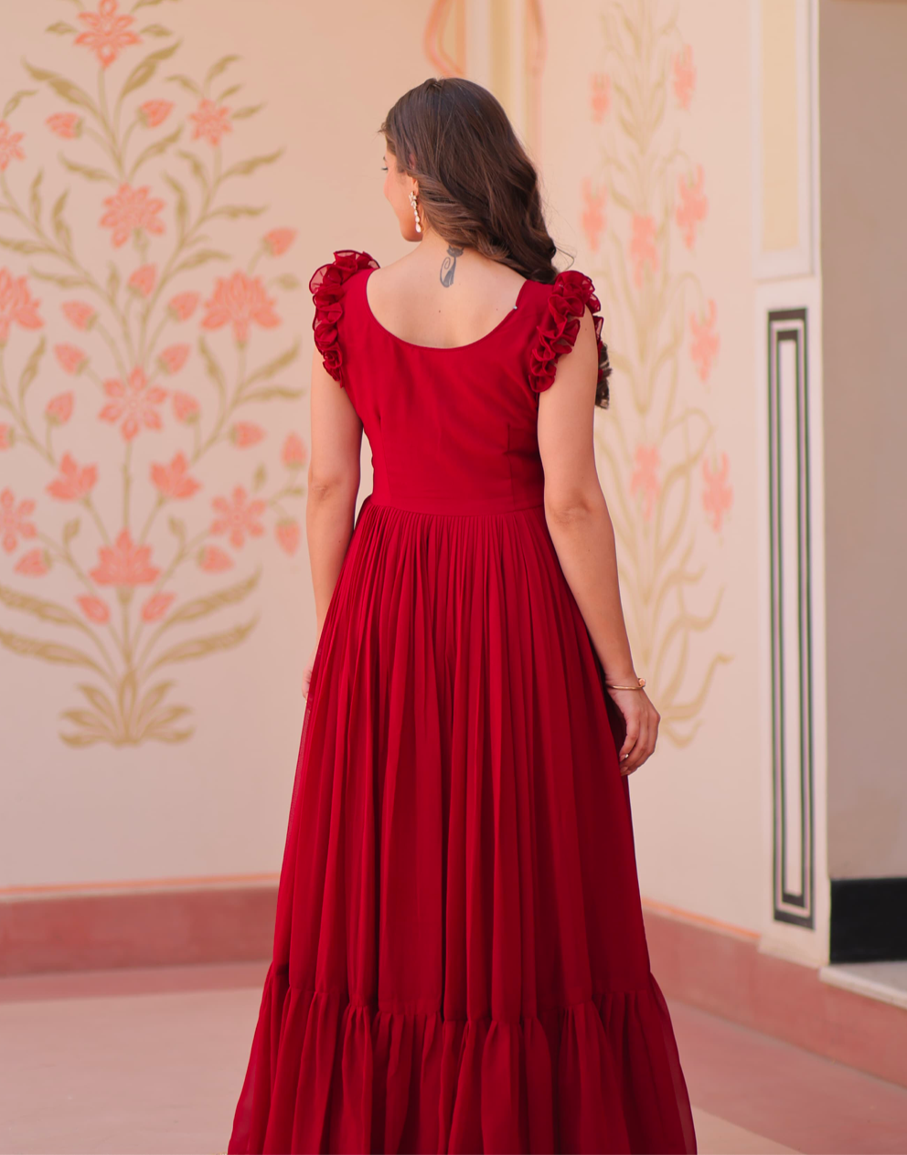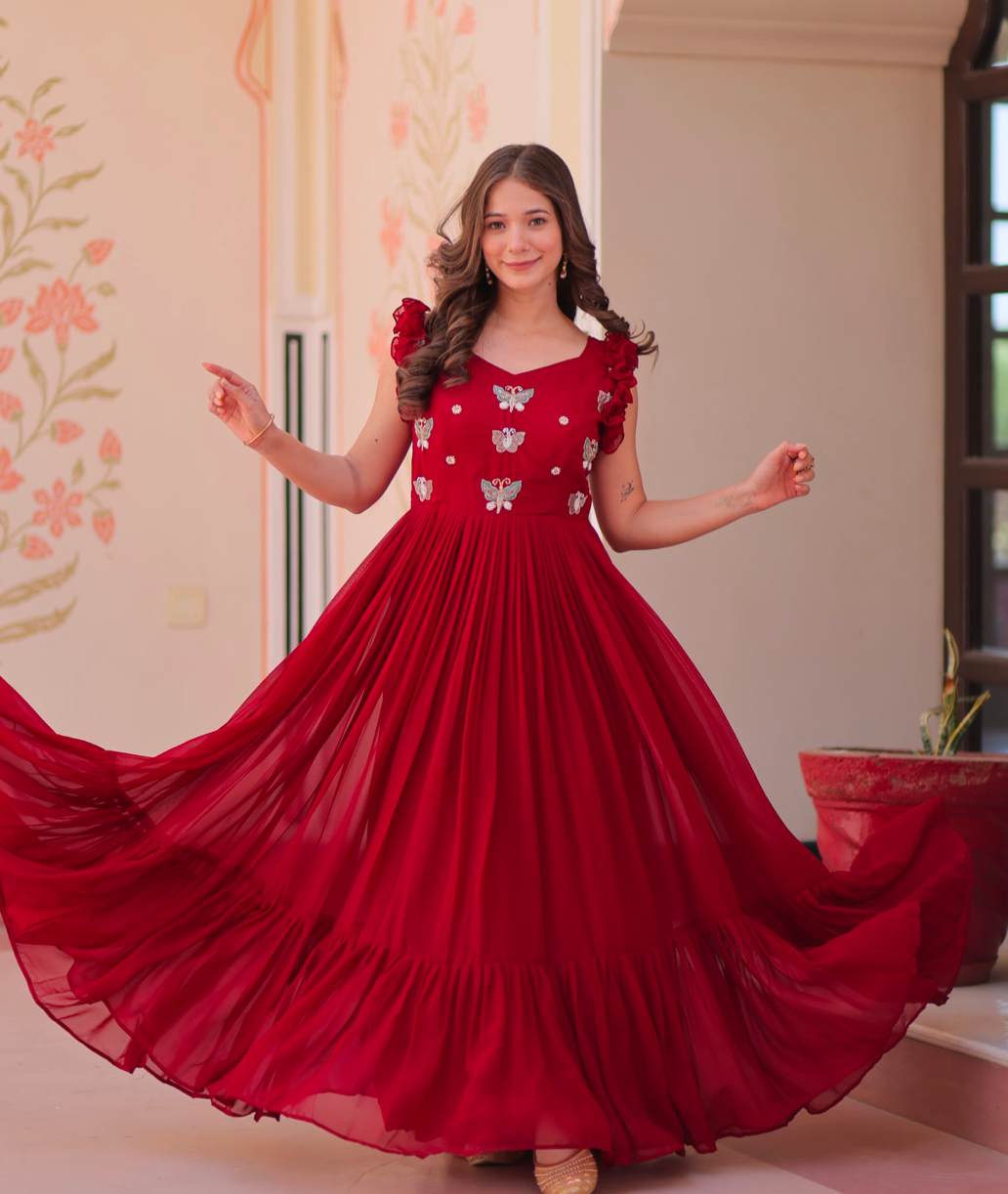 Pattern: Faux Blooming With Sequins Multithreaded Beads Embroidered work | LENGTH :- 56 INCH | FLAIR :- 7 MTR | LINING :- Cotton (Full Inner Top To Bottom) | SLEEVES :- Sleevesless (Shoulder Double Frill Stitching) | STITCHING TYPE:- Frill Stitch | NECK TYPE :- Fancy V Neck