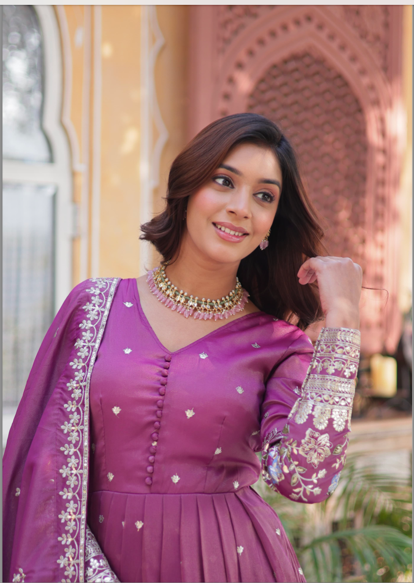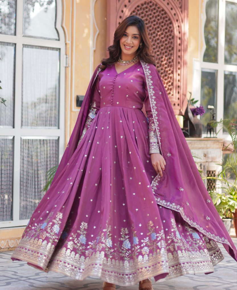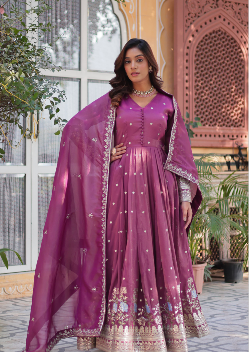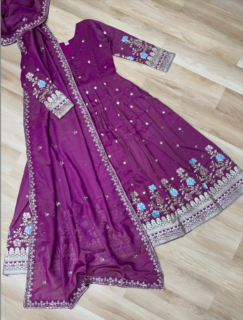 Pattern: TOP FABRIC & WORK : Viscose Cosmos With Foil Embroidery Zari Sequins-work | LENGTH :- 56 INCH | FLAIR :- 3.5 MTR | LINING :- Cotton (Full Inner Top To Bottom) | SLEEVES :- Full Sleeves | NECK TYPE :- Fancy V Neck | STITCHING TYPE :- Stitch With Canvas Patta | DUPATTA FABRIC & WORK : Viscose Cosmos with Embroidered Lace Border | Length:- 2.25 MTR