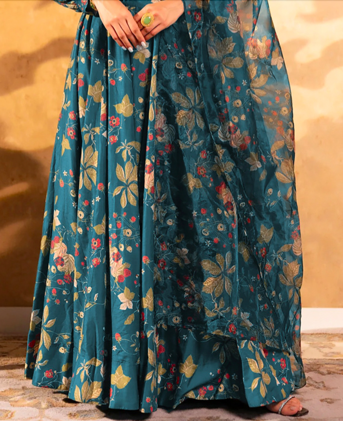 Top: Air Tex Chinon Digital Printed | Closer: Drawstring Zip And Dori | Full Stitched With Nonwen Patta And Full Inner | Length: 40-42” Inch | Flair: 5 Mtr Approx | Length: 40-42” Inch | Flair: 3.5 Mtr Approx |