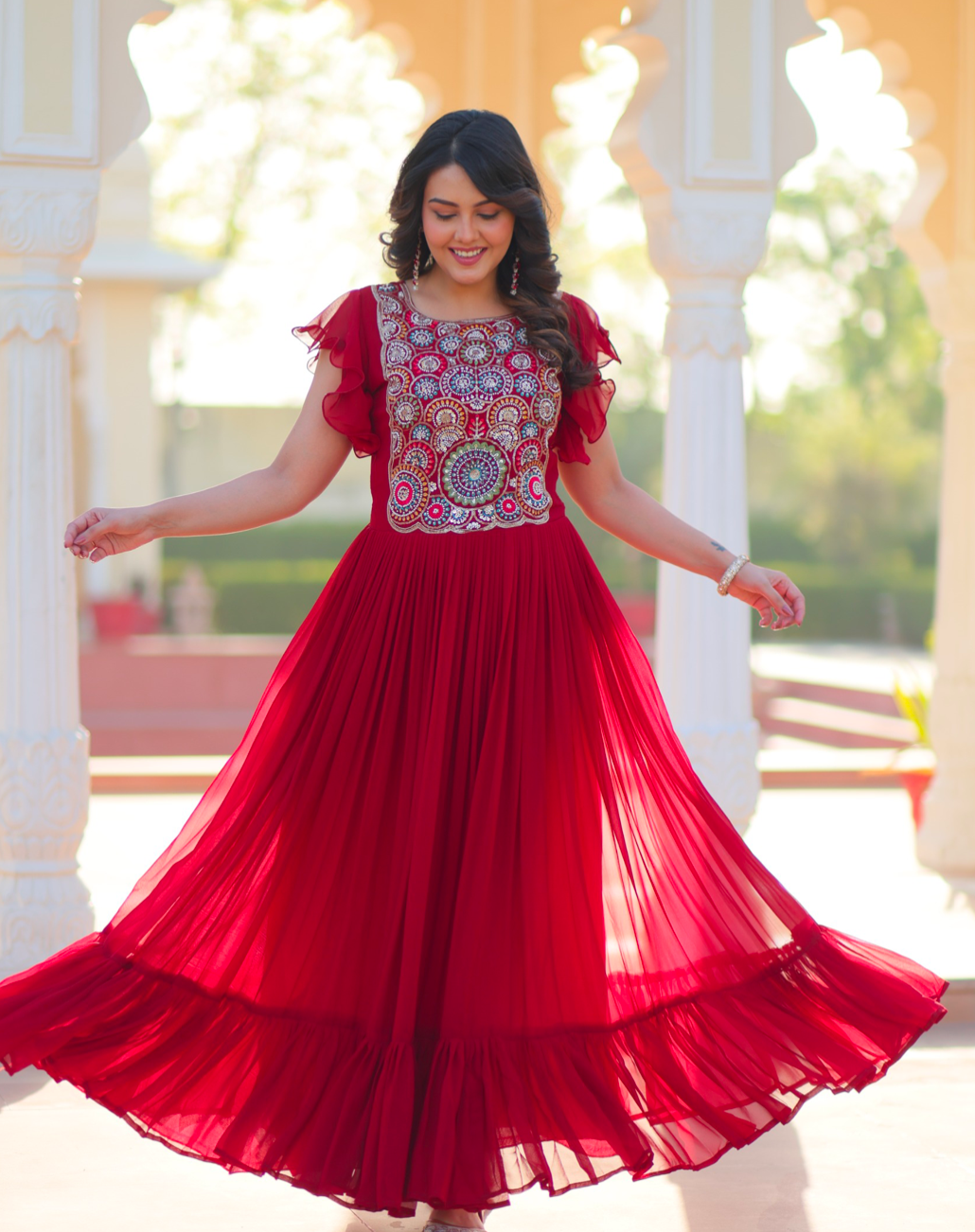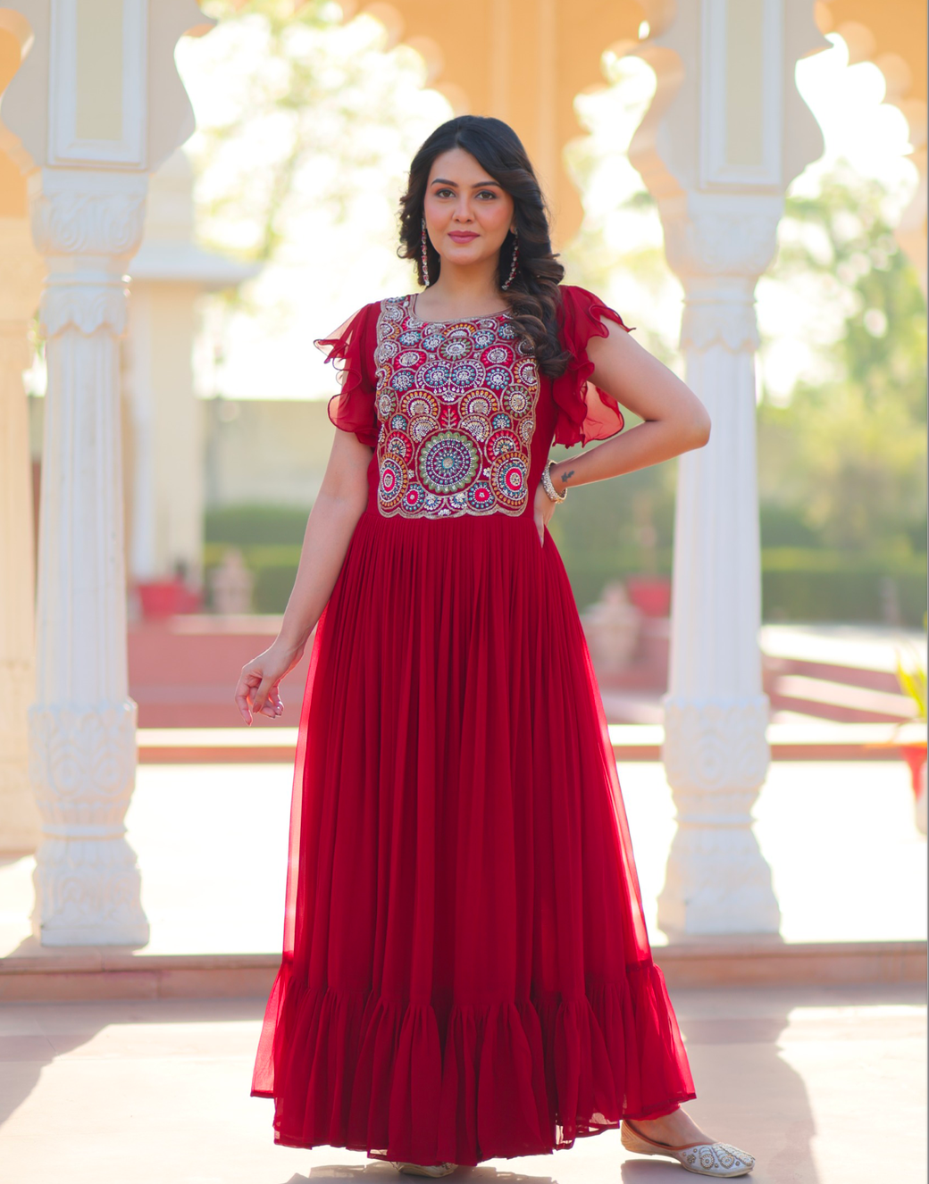 Pattern: Faux Blooming With Beads and Sequins Multithreaded Embroidered work | Length :- 56 INCH | Flair :- 7 MTR | Lining :- Cotton (Full Inner Top To Bottom) | Bell Sleeves | Frill Stitch |Round Neck