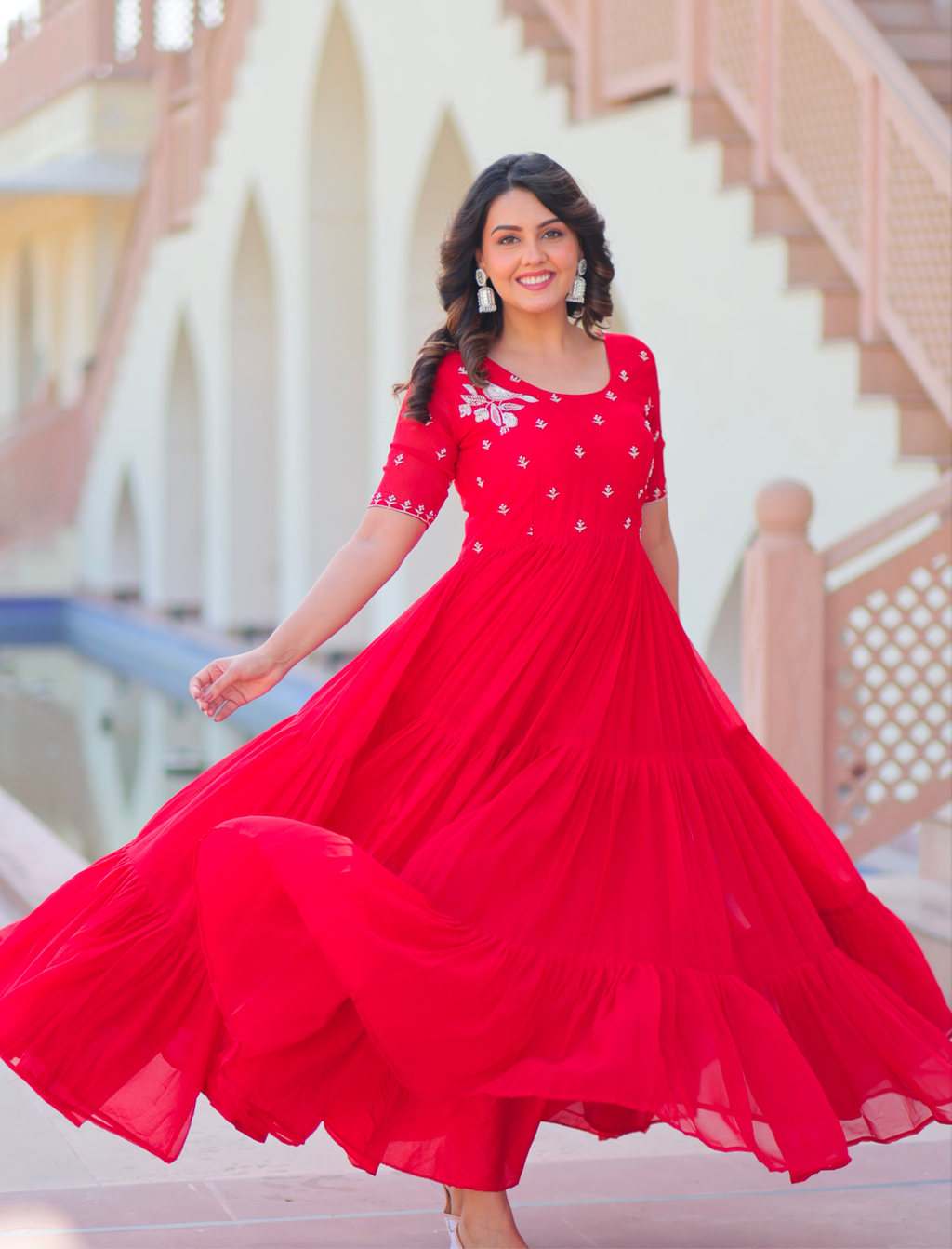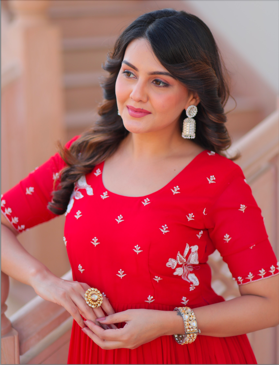 Pattern: Faux Blooming with Beads embroidery-work | LENGTH:- 56 INCH | FLAIR:- 12 MTR | LINING:- Cotton (Full Inner Top To Bottom) | SLEEVE:- Half Sleeves | NECK TYPE:- Round Neck