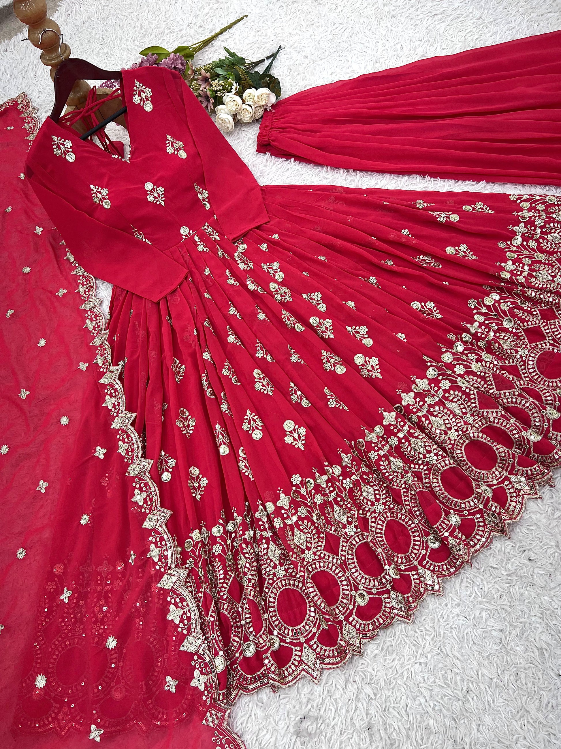 Pattern: Gown Fabric : Heavy Faux Georgette With Full Heavy Embroidery Sequence Work with Sleeve | Gown Inner : Micro Cotton | Gown Length : 51-52 Inches | Gown Flair : 3 Meter Bottom Fabric : Micro Cotton With Elastic | Dupatta Fabric: Heavy Faux Georgette With Heavy Embroidery Sequence work and Lace Border