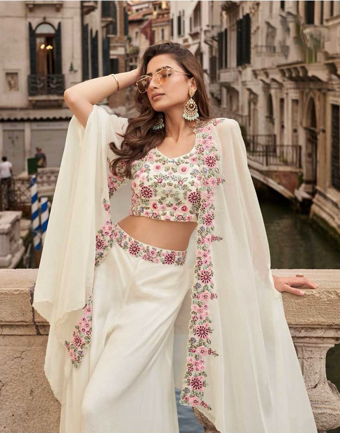 Pattern: Blouse/Palazzo/Shrug :- Premium Real Chinon Silk / Viscose Jacquard Silk ( Trendy Festive Look Front And Back Embroidered Shrug With Embroidered Blouse On Hand Embellished Mirror Work With Stylist Palazzo
