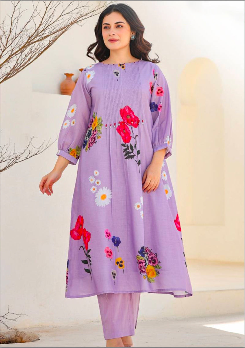 Pattern: Floral Printed Round Neck Pure Cotton A-Line Kurta With Trousers