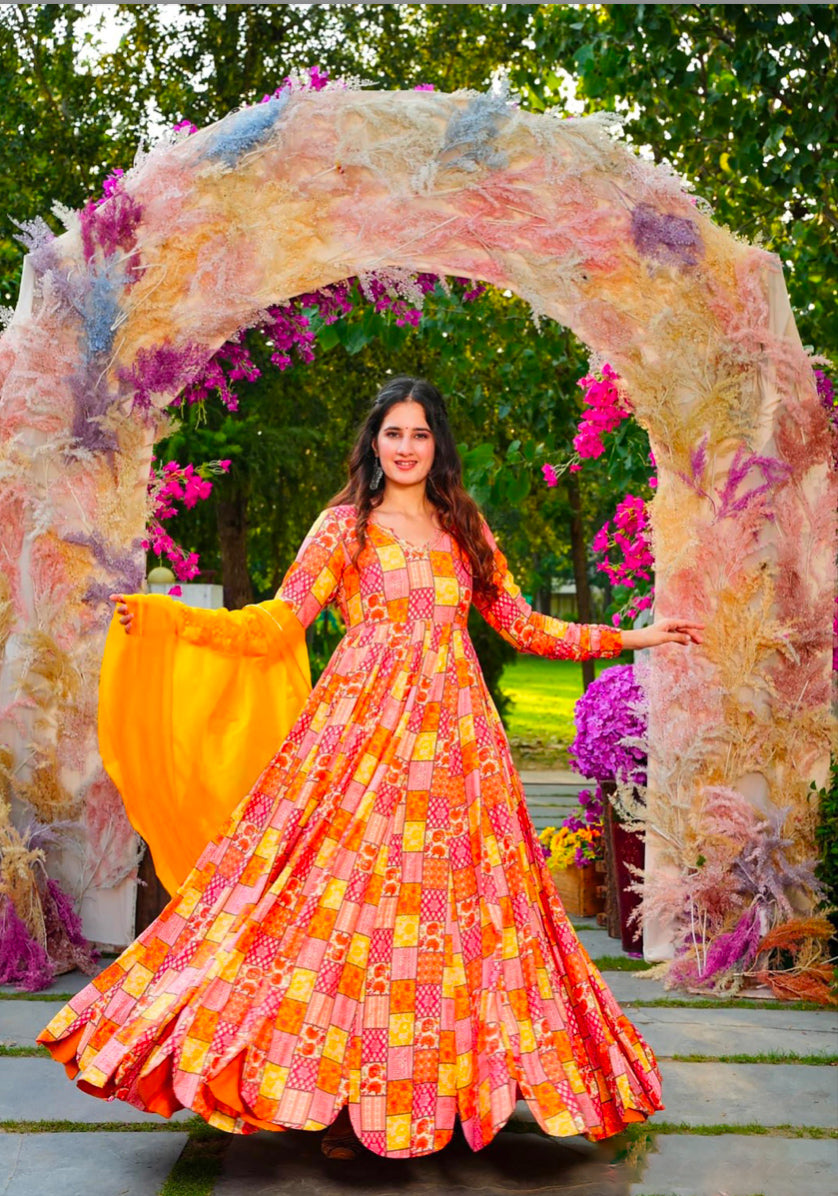 Pattern: Rayon | Inner: Half Inner | Length: Up To 56 Inch” | Flair: 3.5 Mtr Approx | Stitched Type: Full Stitched | Dupatta: Georgette | Length: 2.5 Mtr Approx | Style: Anarkali, Fully Flared