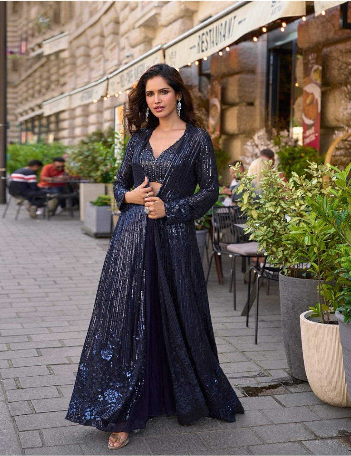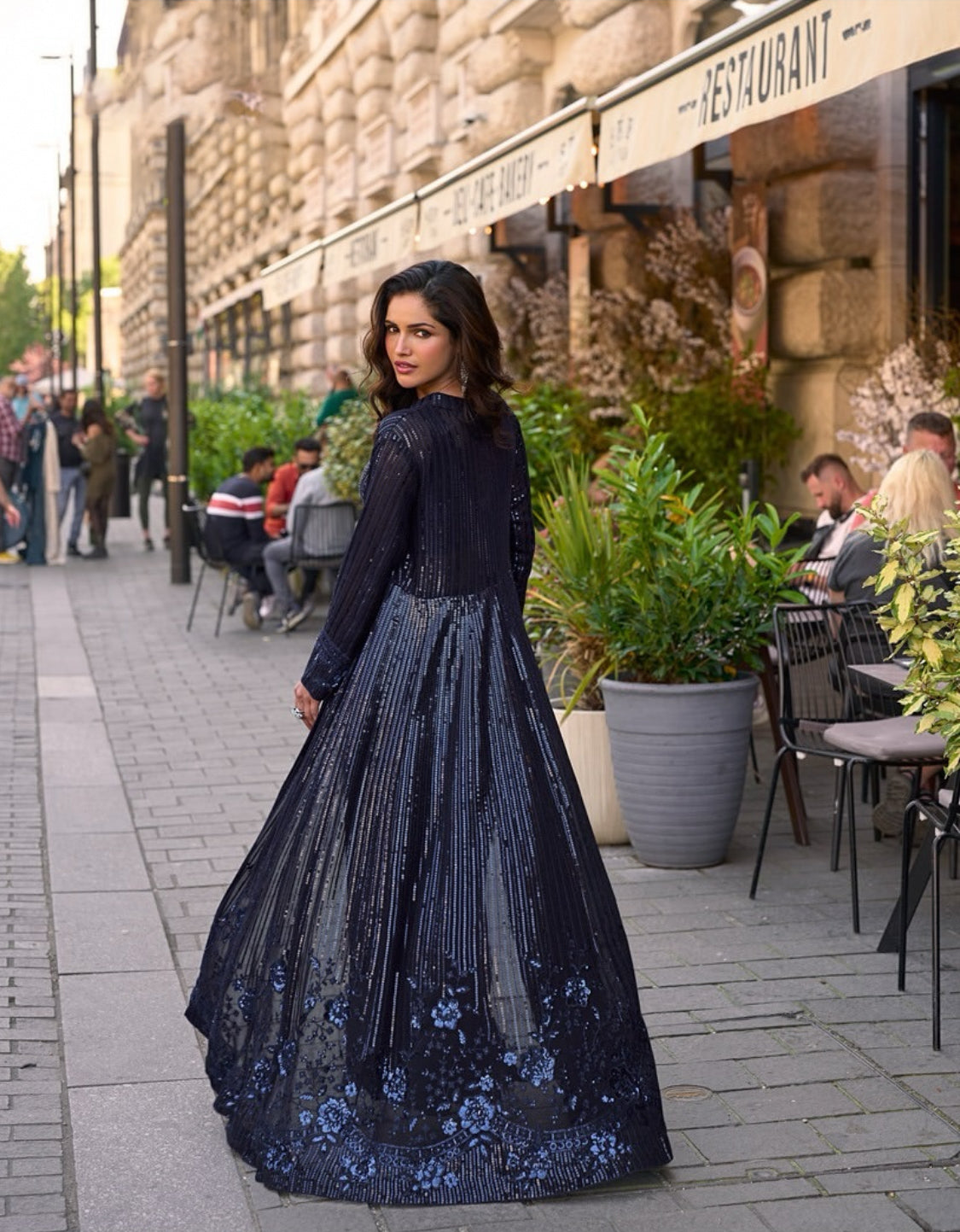 Pattern: Blouse/Palazzo/Jacket :- Real Premium Georgette ( Full Heavy Look Front And Back Embroidered Floor Length Jacket With Embroidered Blouse And Palazzo) |
