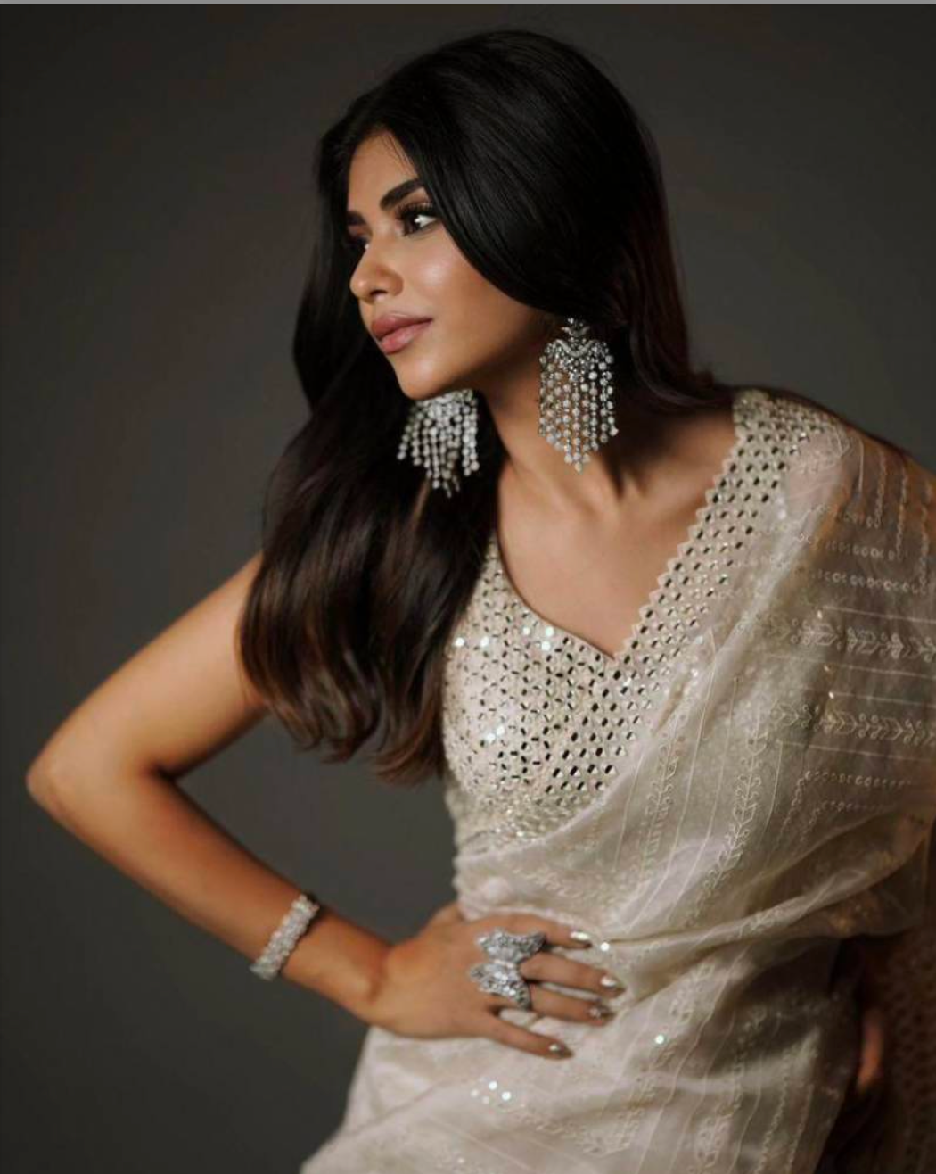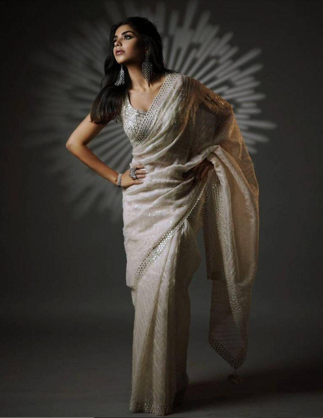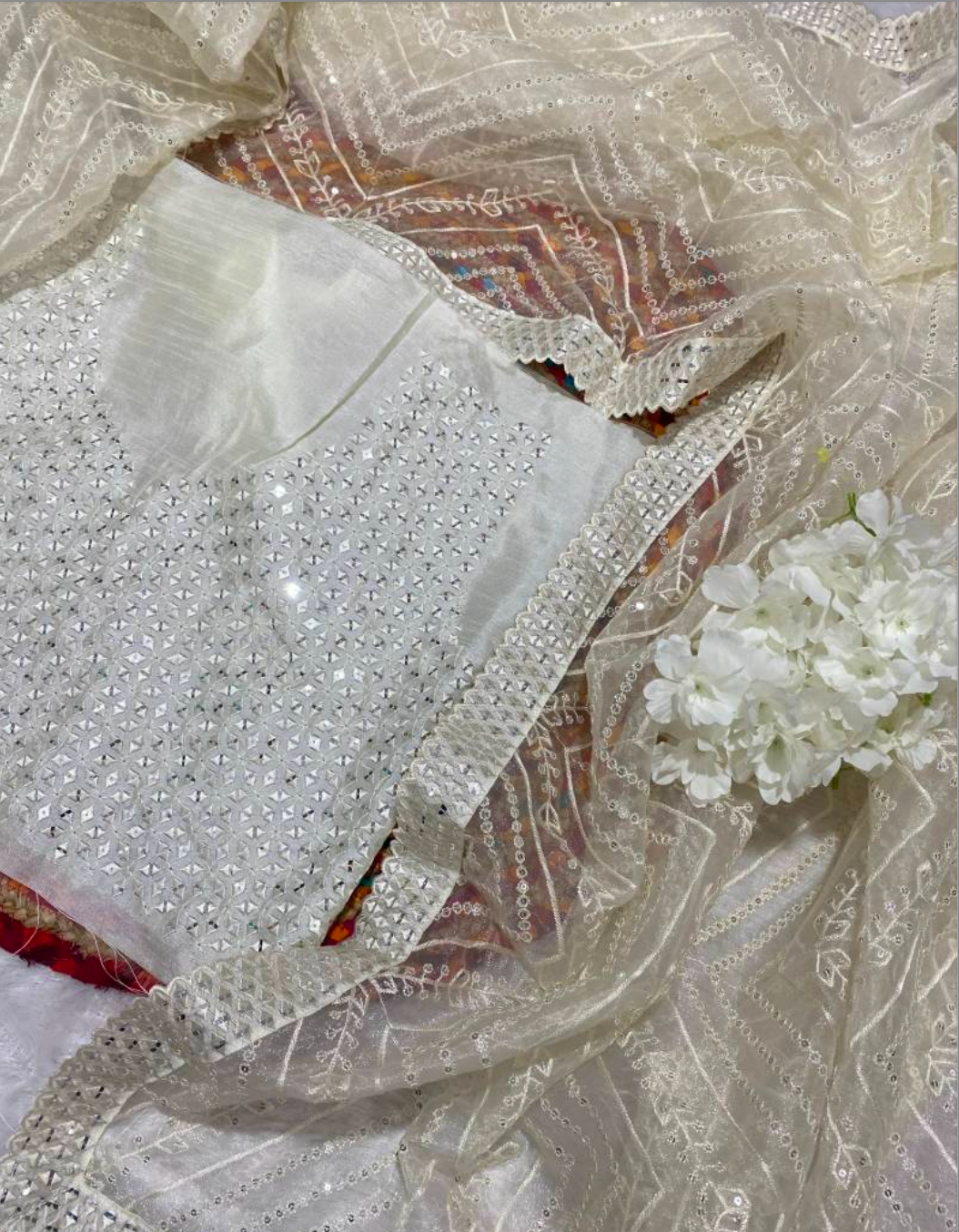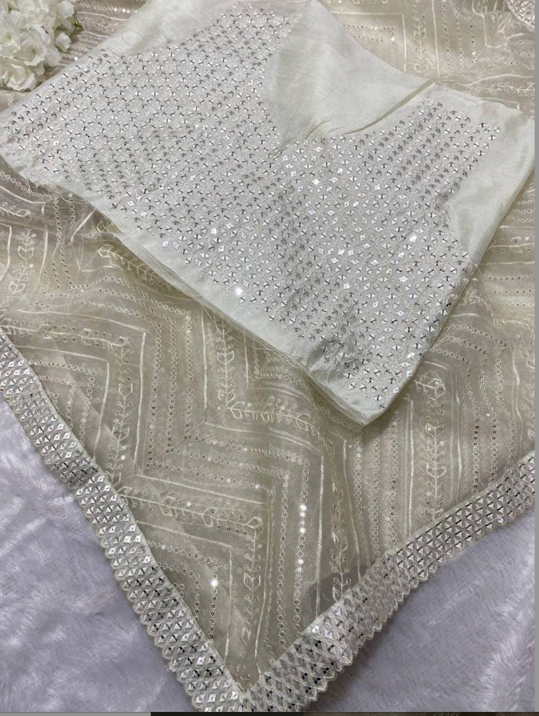 Pattern: Sequins with thread work Embroidery in all over 7mm arca border | blouse: Trendy embroidery blouse | length 5.5 mtr saree and 0.80 mtr un-stiched blouse