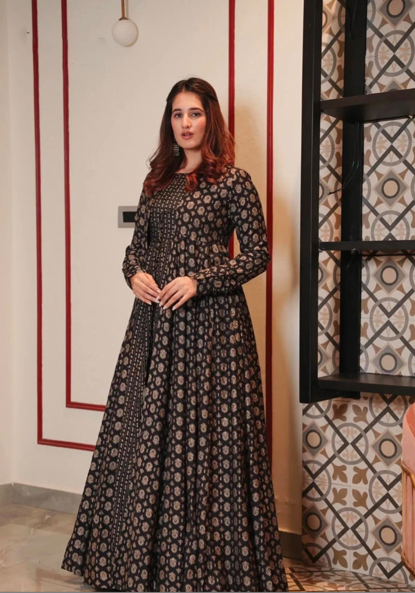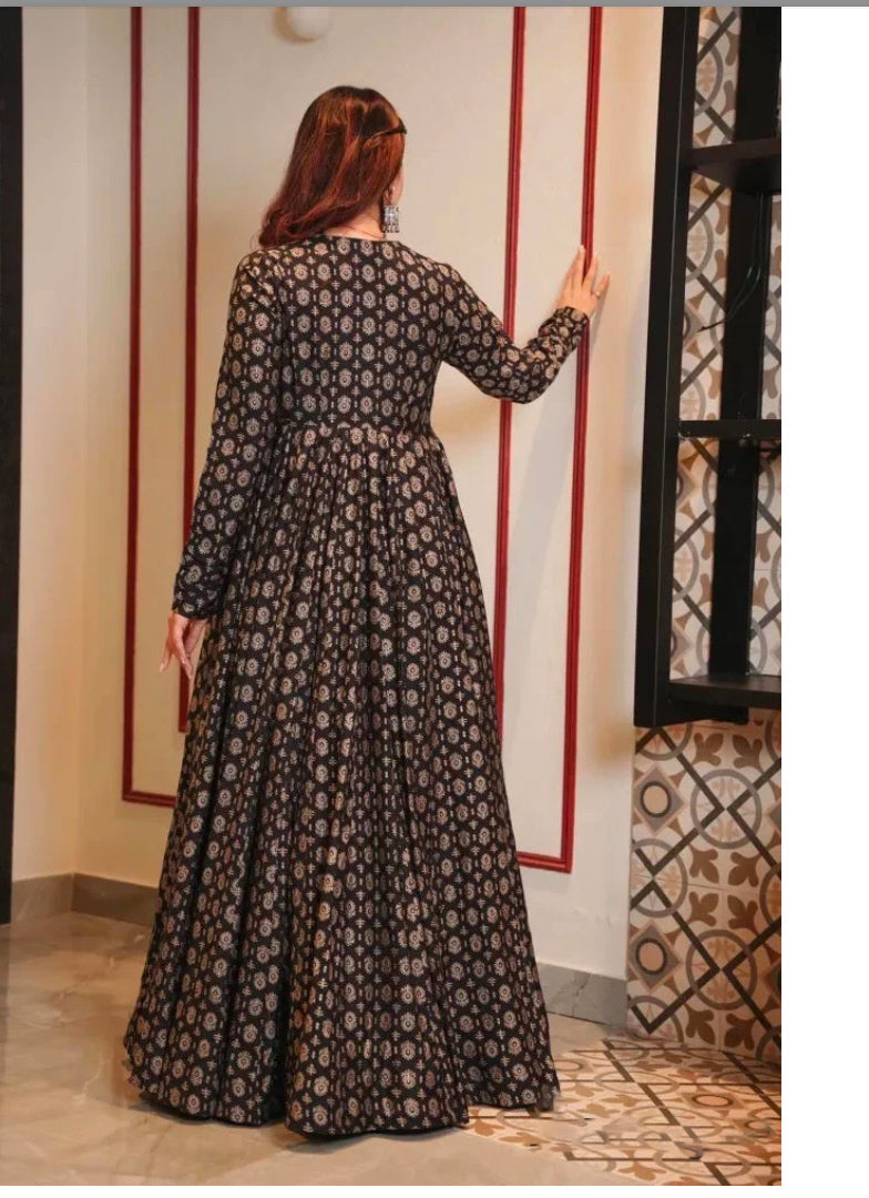 Details: Shrug Fabric : - Pure Maslin With Heavy Digital Print | Shrug Length: - 55-56” | Gown Fabric:- Pure Maslin With Heavy Digital Print And Full Inner)