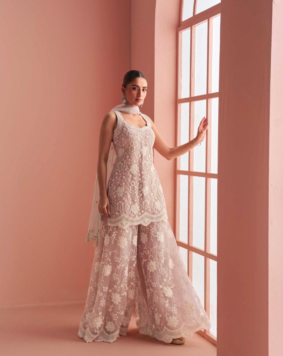 Pattern: Front And Back Embroidered Beads Touch Up Top With Heavy Embroidered Palazzo And Dupatta